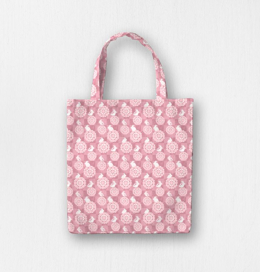 市松模様地に桜の花鞠とうさぎを遊ばせました。
