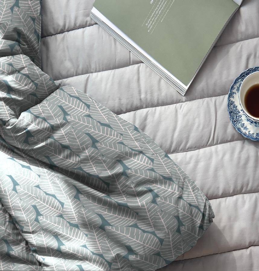 パステルブルーの背景にクリーム色の葉柄が繰り返されるパターンが調和したデザインです。