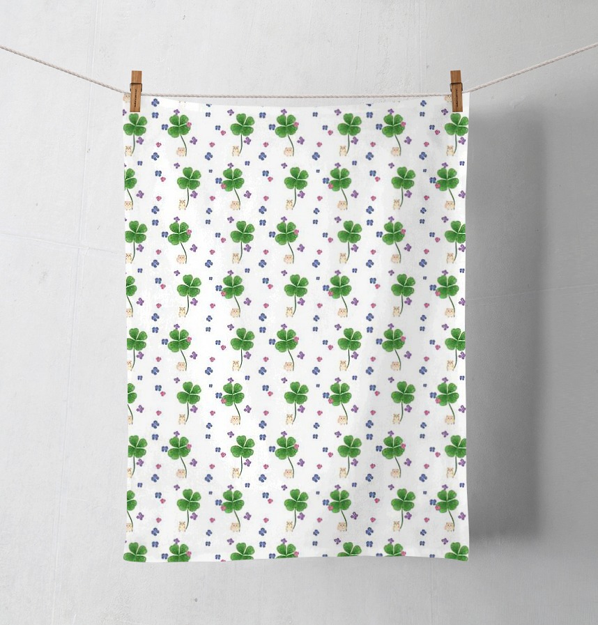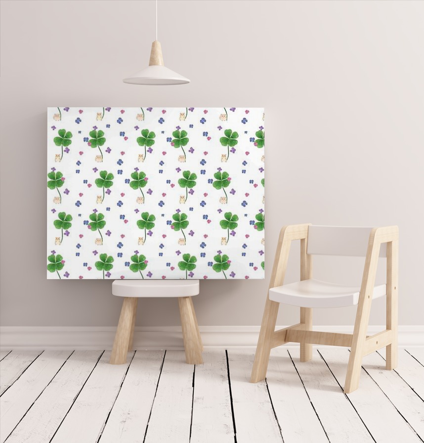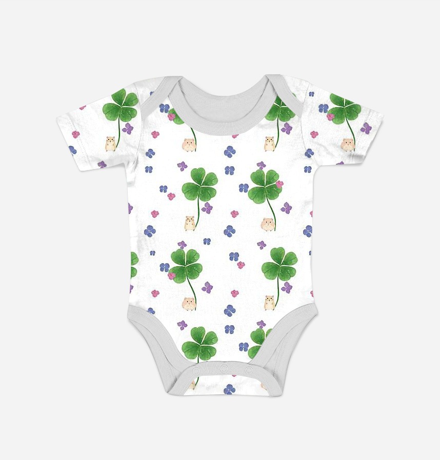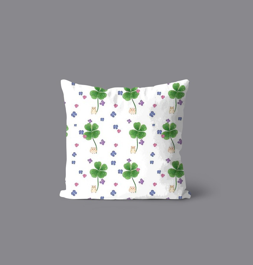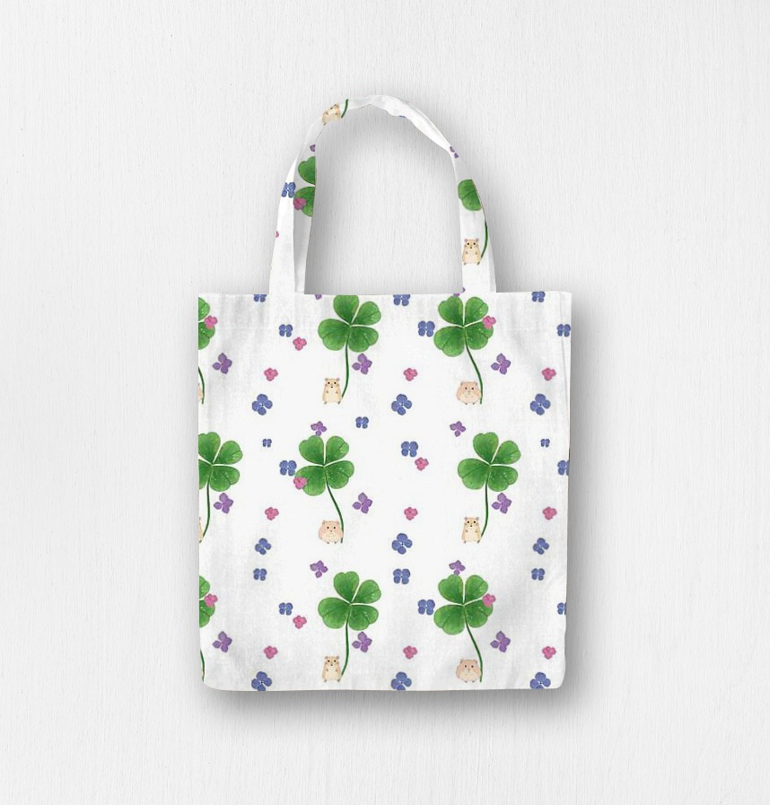 パターン説明 四つ葉のクローバーとハムスター。 アジサイの花雨を避けて四つ葉のクローバーの傘をさしているハムスターのパターンです。 可愛さと童心が混ざっていて子供の物、小物、などに使われると一層可愛さが引き立つでしょう。