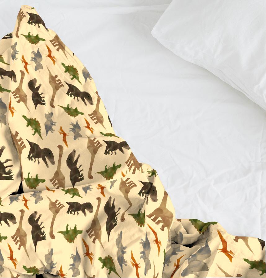 大きめの水彩画風の恐竜柄のデザインです。明るめにプリントされるので背景はオレンジっぽい色になります。恐竜好きや男の子におすすめです。