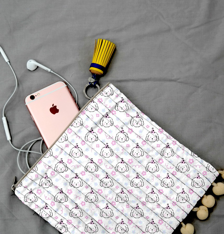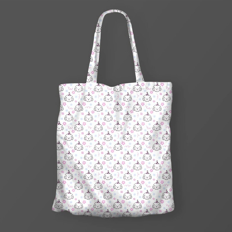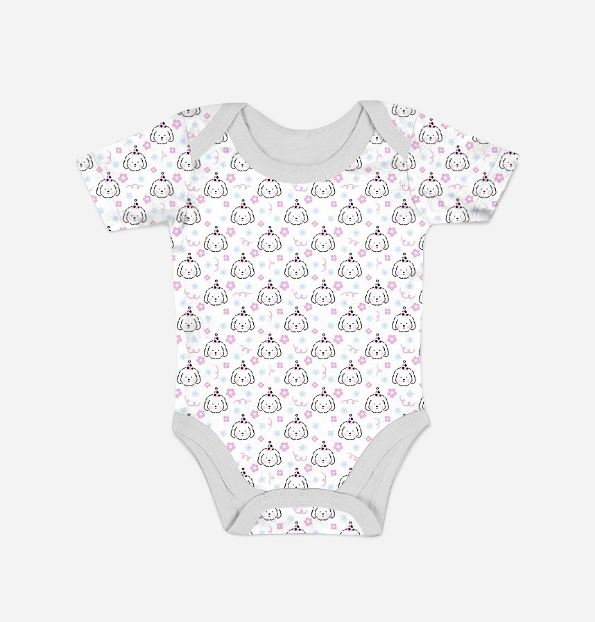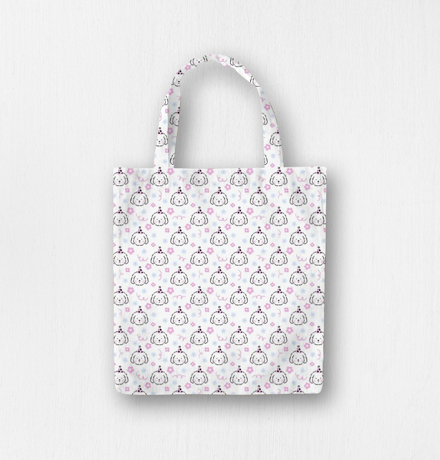 やわらかなパステルカラーと、かわいい子犬のキャラクターが調和した愛らしいパターンデザイン。
