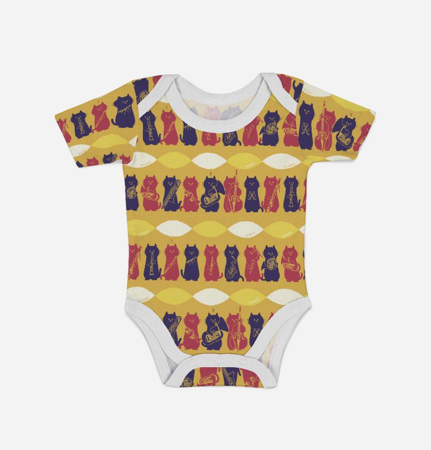 猫たちが吹奏楽でおなじみの楽器をもって並んでいます。吹奏楽好きな人や楽器演奏が好きな人におすすめ。レッスンバックやポーチ、マスクなどを作ってみてはどうですか。子供服もかわいいです。