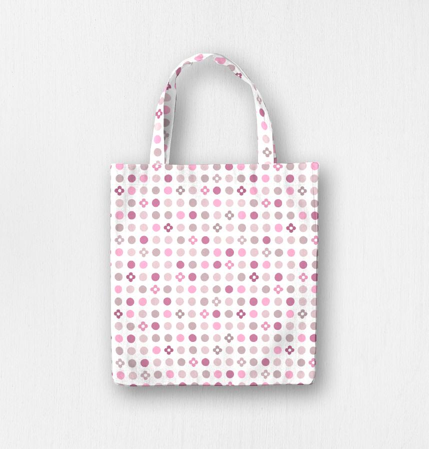 ランダムに花柄模様が混ざっている水玉模様の生地です。
