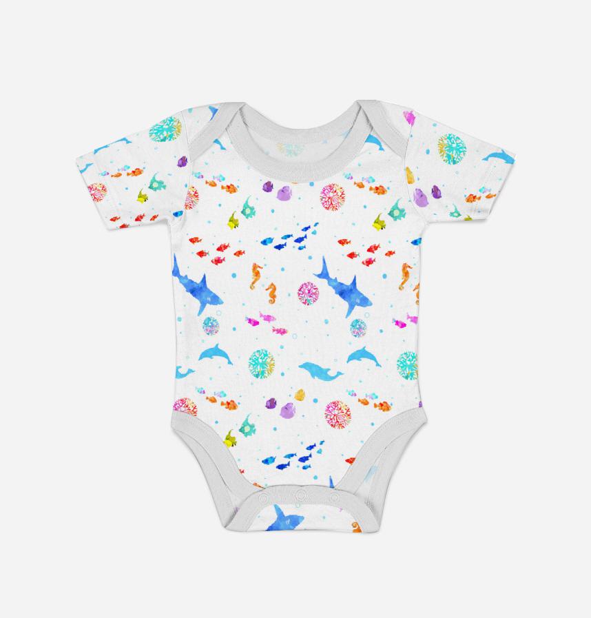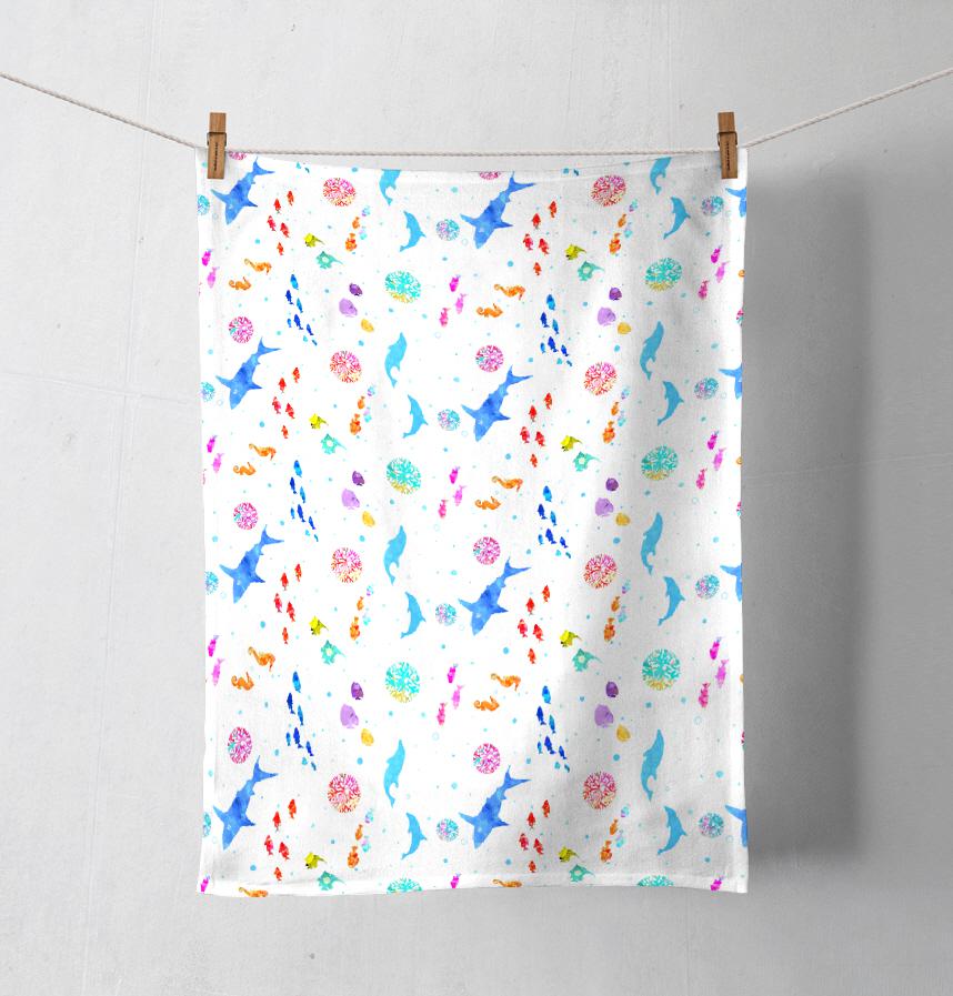 パターン説明 白地にカラフルな海の生き物達が大人可愛い。夏向きの柄です。キッズ用にも!