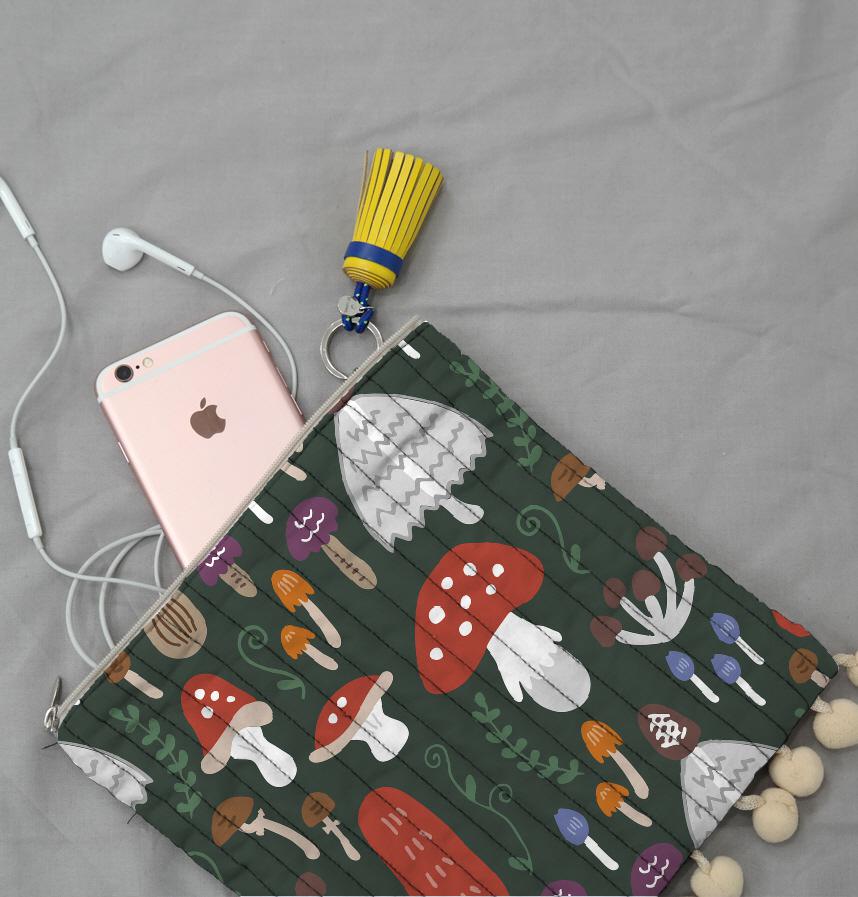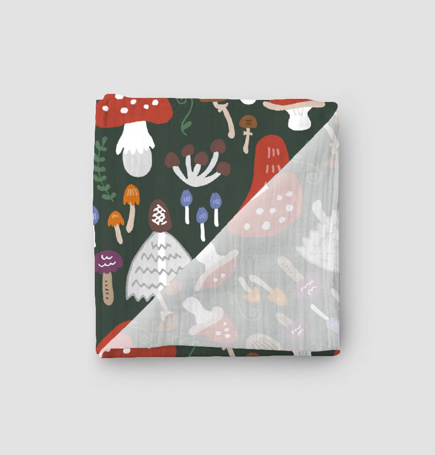 手描きのラフ感がかわいい、カラフルなきのこ柄。