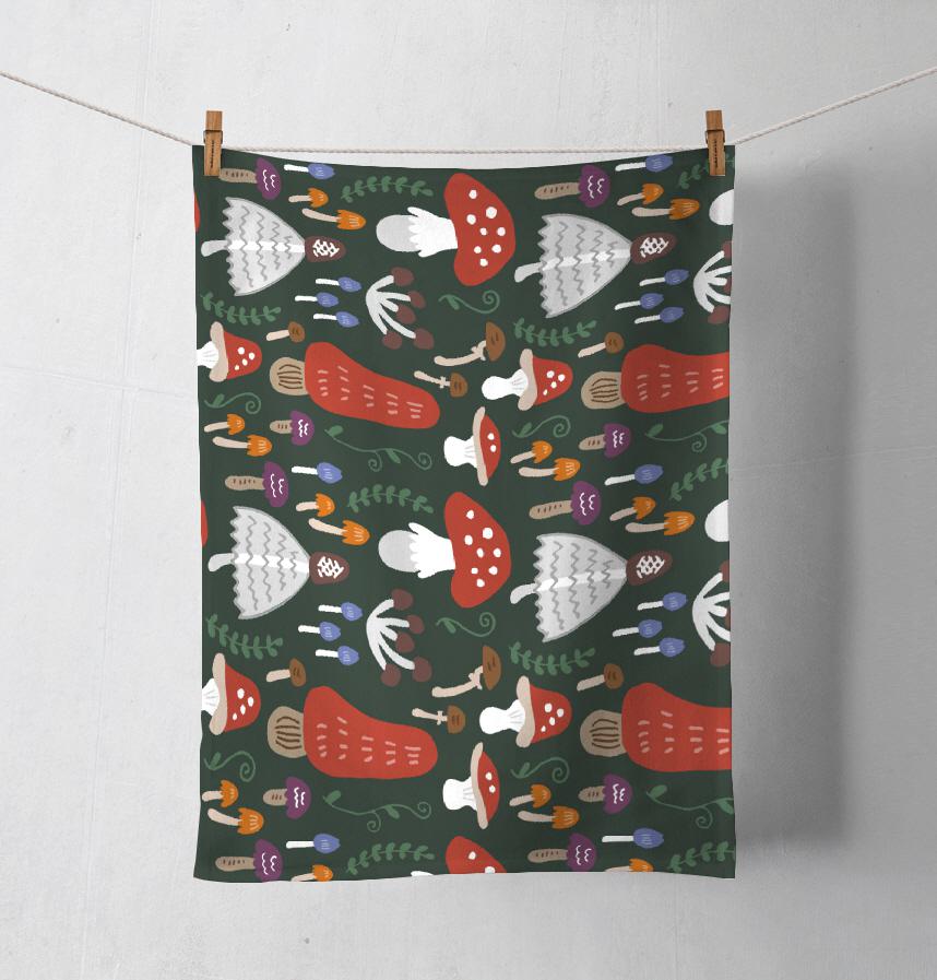 パターン説明 手描きのラフ感がかわいい、カラフルなきのこ柄。