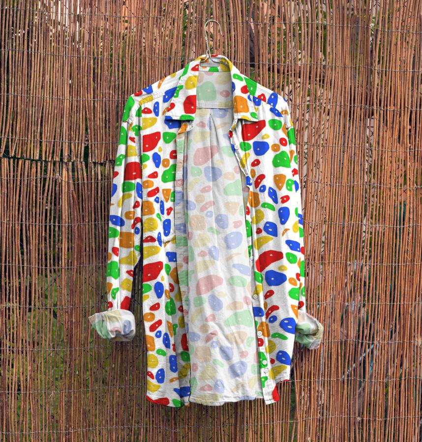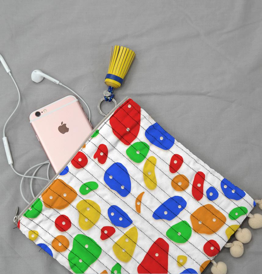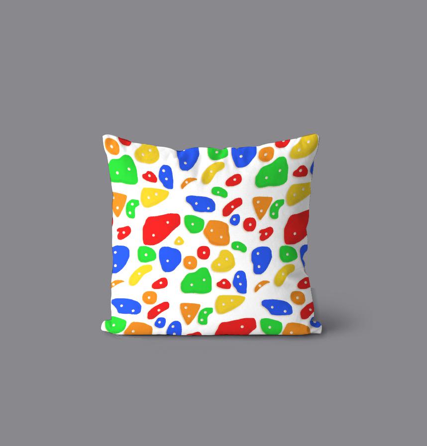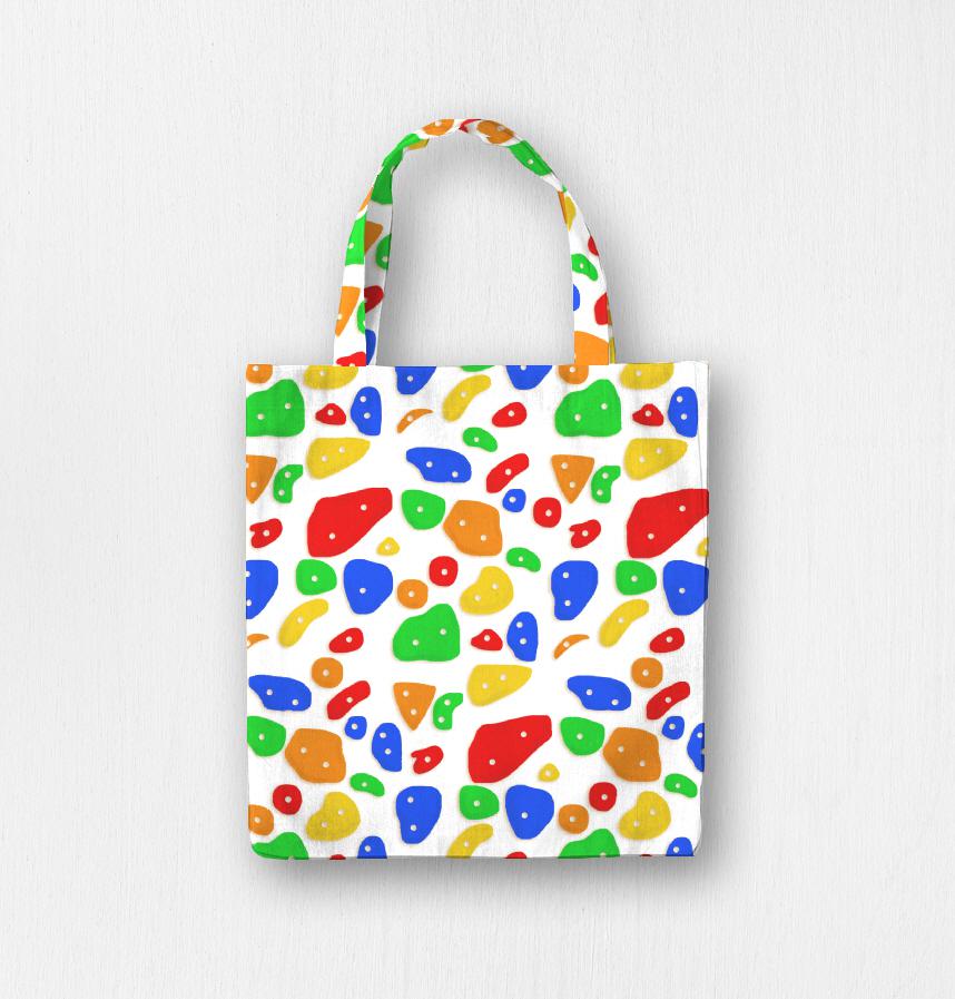 ゼリービーンズみたいなカラフルなボルダリングホールド柄の布です。