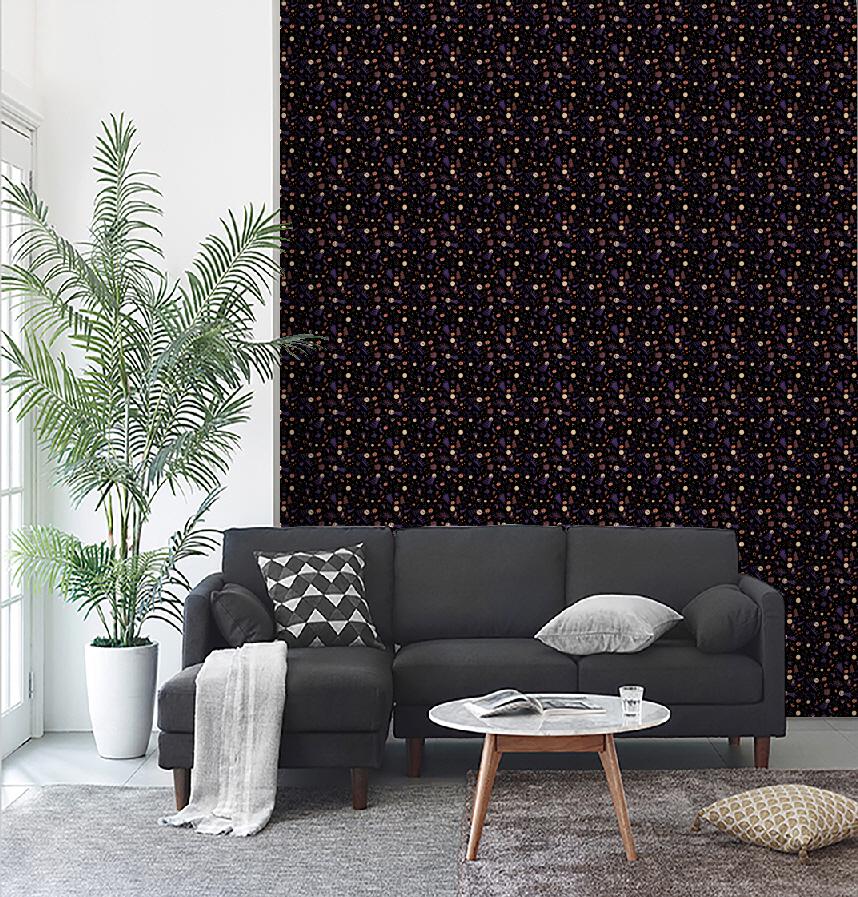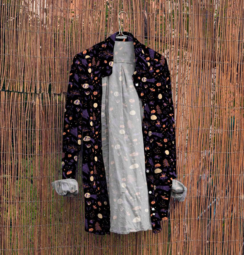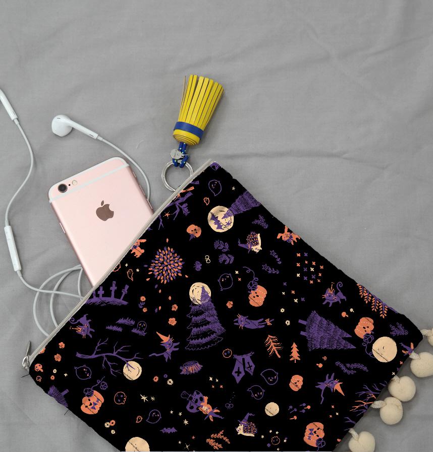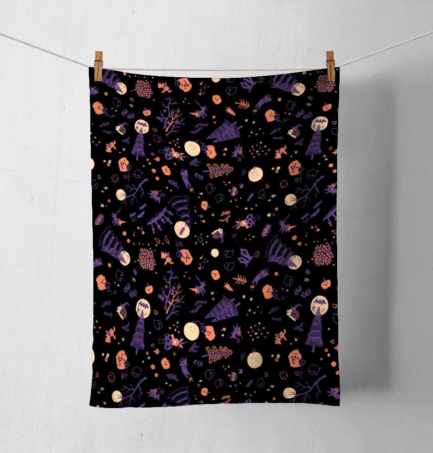 木々や草やきのこやお花。うさぎ、ねこ、ハリネズミ。コウモリと月。おばけちゃんに、かぼちゃたち。ちょっとダークでちょっと楽しいハロウィンの柄です。