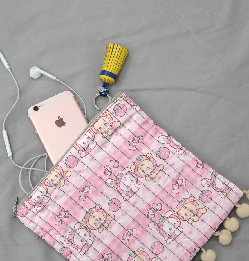 いちごの着ぐるみを着た、可愛いくまとうさぎの赤ちゃんたち。