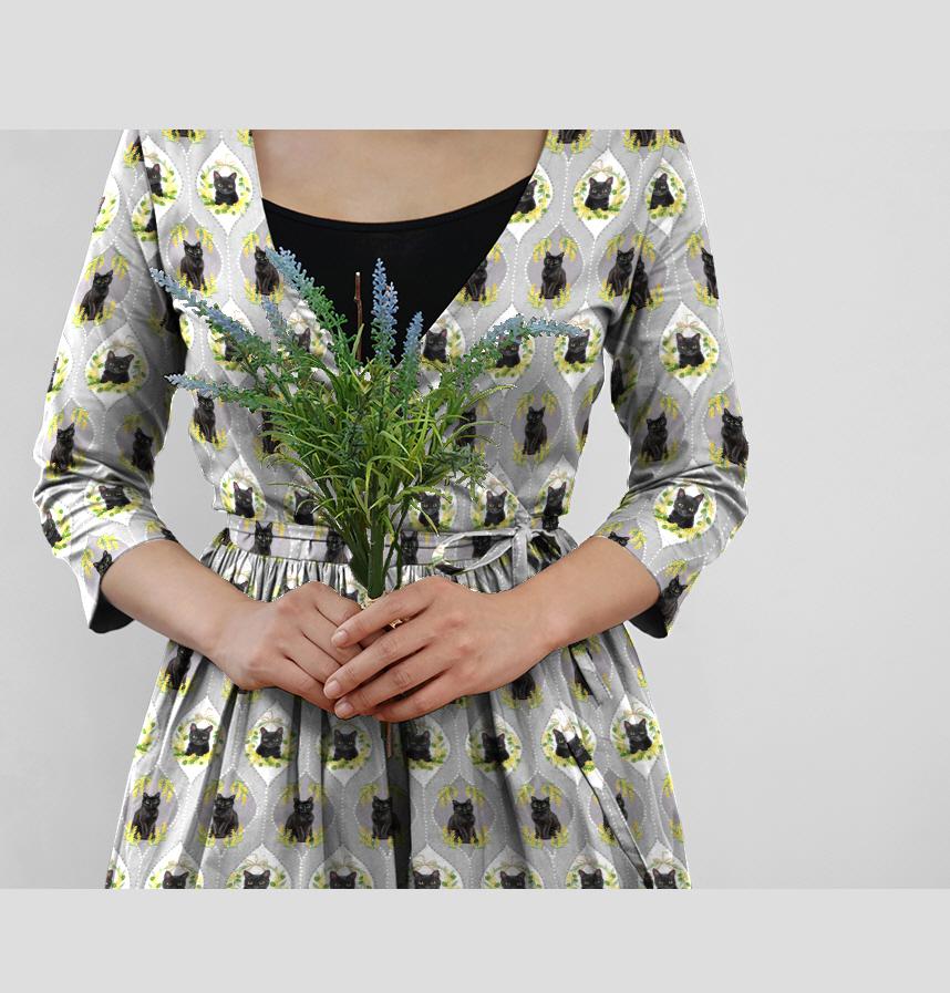 ポストカード用に描いた黒猫とミモザのイラストをもとに、生地デザインにまとめました。