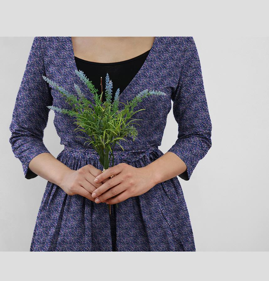 紺色の地色に、パープル系、ブルー系、ダスティピンクやグレー系の小花柄で、
