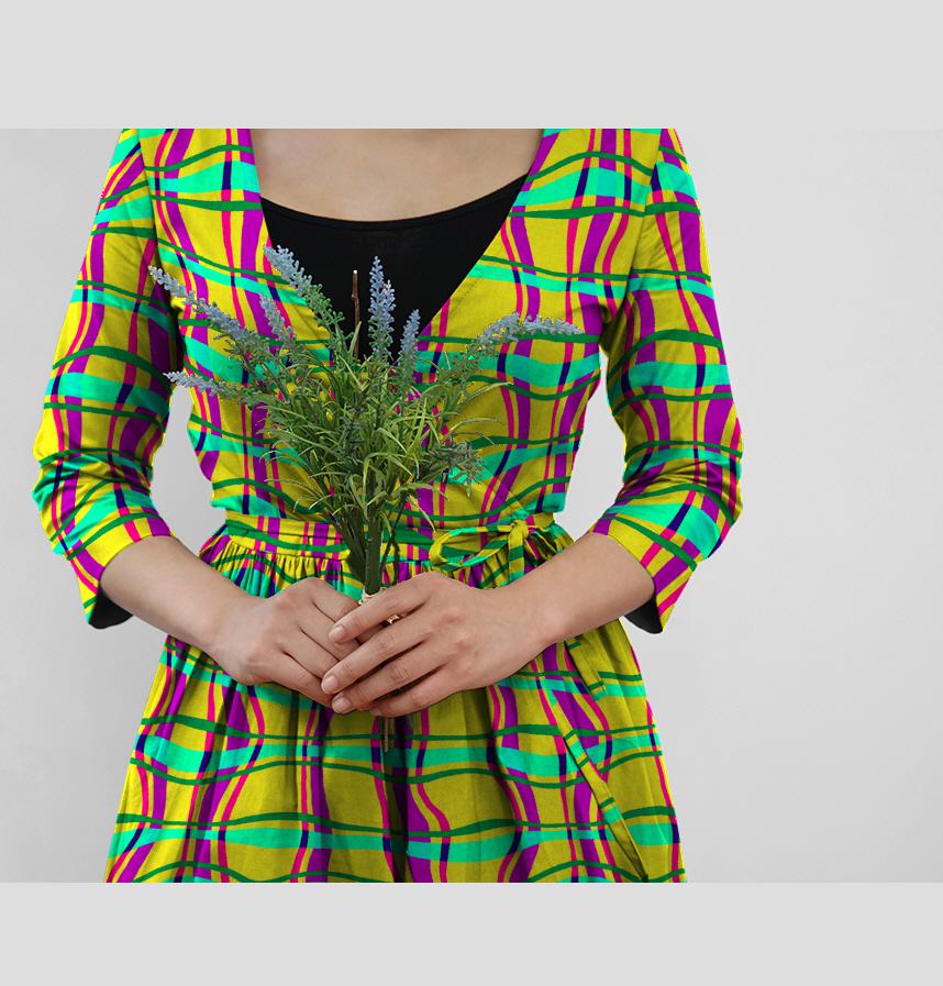 パターン説明 不規則なマドラスチェック柄を歪ませた個性的な柄です。