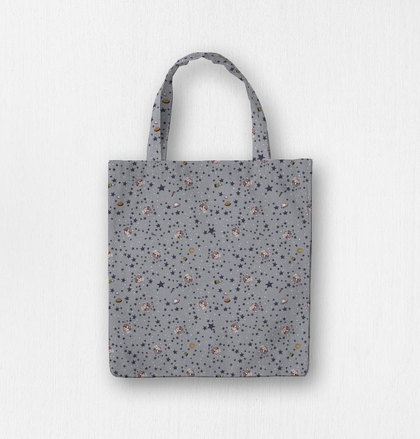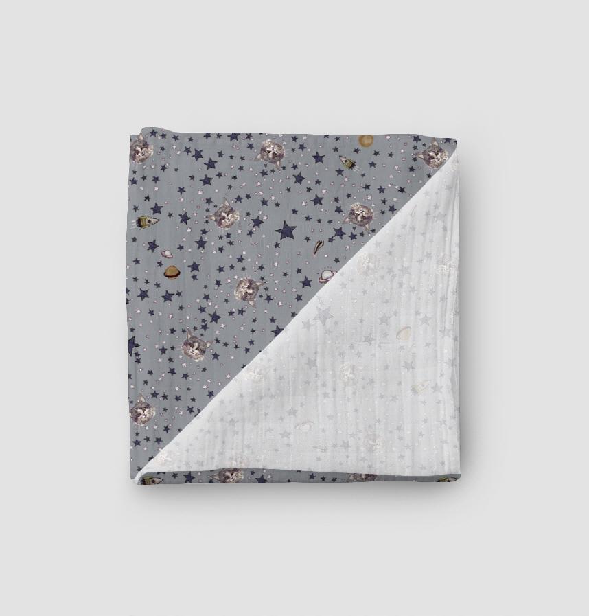 クールなグレーの宇宙空間に星と猫とロケットにUFOと彗星と色々と楽しい柄です。