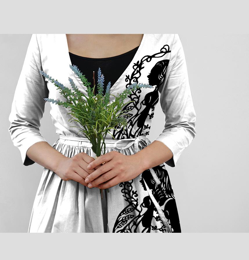 千も万も、尽きることのない豊かさを人々に与える、豊潤の女神をイメージして作った切り絵を生地にしました。この生地を使って、ドレスや、クッションカバー、色々な物を作り、それを見るたびに、豊かさを感じとっていただければ、嬉しいです。 少し独特なデザインではありますが、この生地を使い、作品になるととても素敵な物に仕上がります。お手にとってお使いいただけると幸いです。