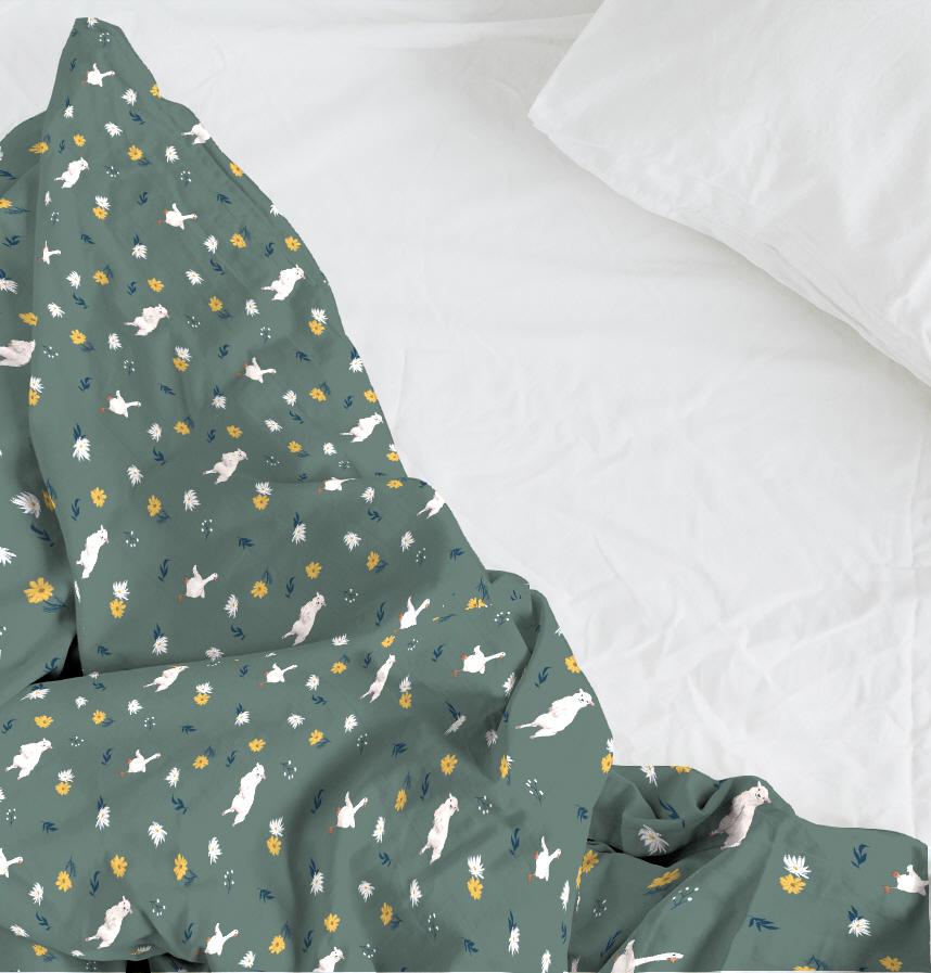 ニュアンスカラーの背景に、陽気に弾むひつじとアヒルを描きました。
