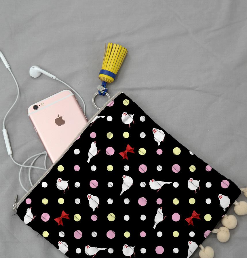 文鳥さんの可愛いポーズを水玉の中に入れました。ちょっと甘めの雰囲気ですが、背景を黒にして落ち着きを持たせました。サムネイルのパターン1セットで16.87cm*16.87cmサイズです。