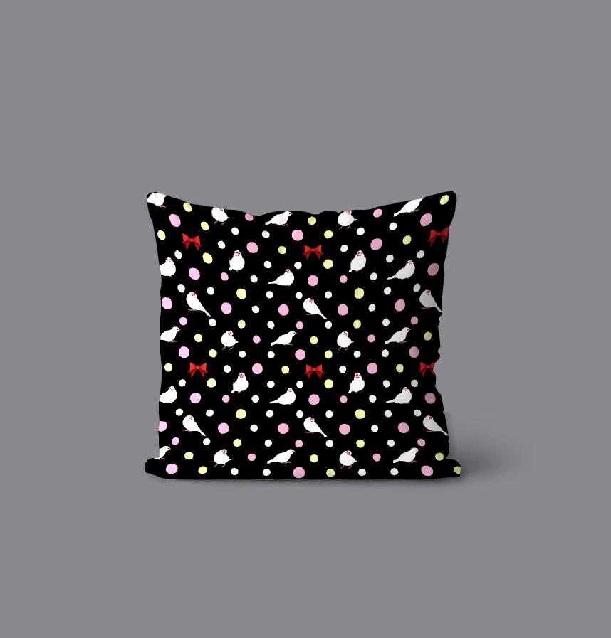 パターン説明 文鳥さんの可愛いポーズを水玉の中に入れました。ちょっと甘めの雰囲気ですが、背景を黒にして落ち着きを持たせました。サムネイルのパターン1セットで16.87cm*16.87cmサイズです。