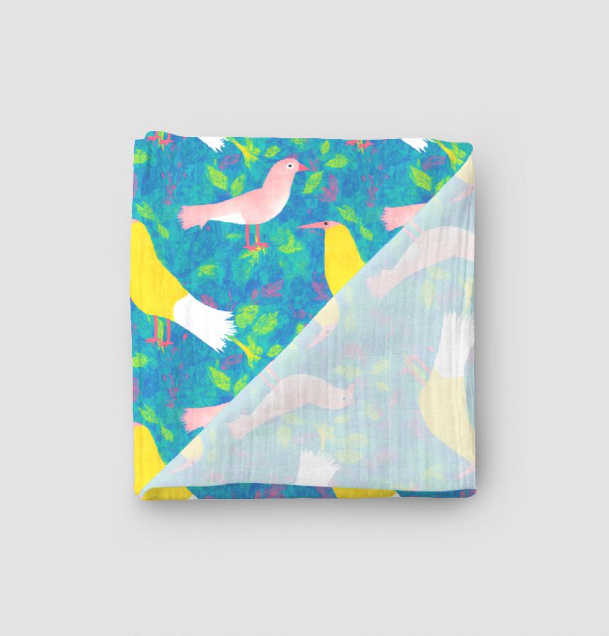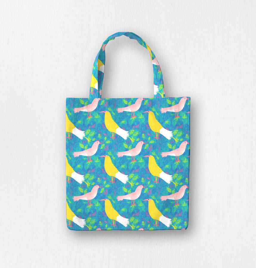 葉っぱの背景にユニークな形の鳥が向き合うデザインです。