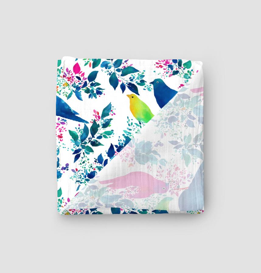 水彩タッチの鳥と植物が並んでいるデザインです。