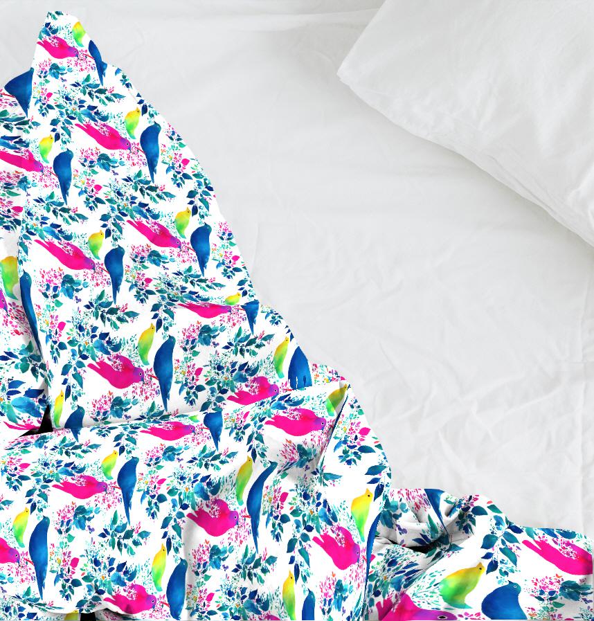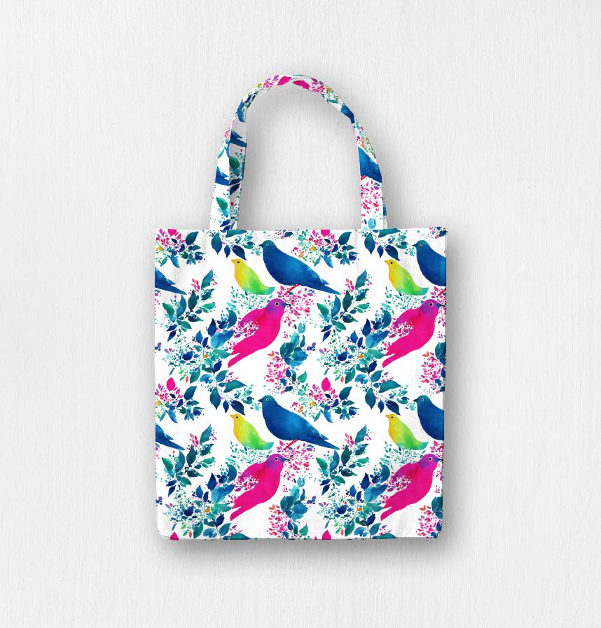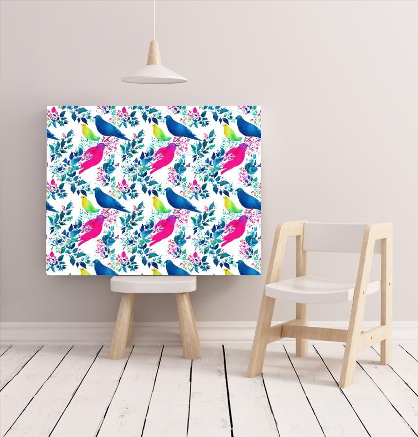 パターン説明 水彩タッチの鳥と植物が並んでいるパターン