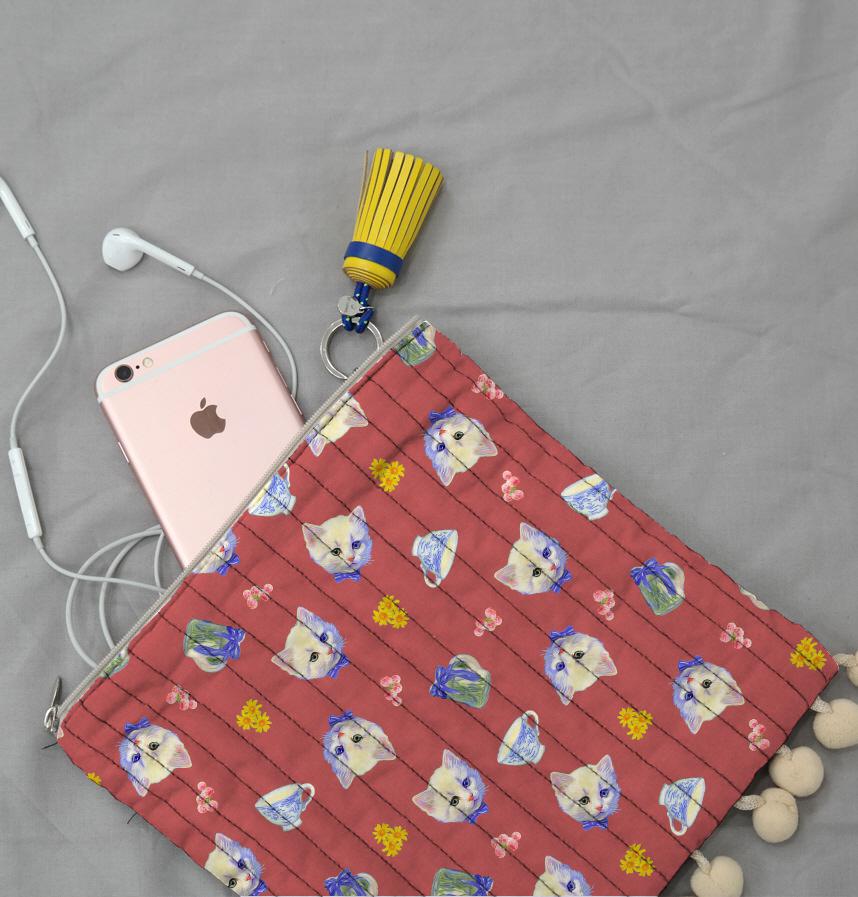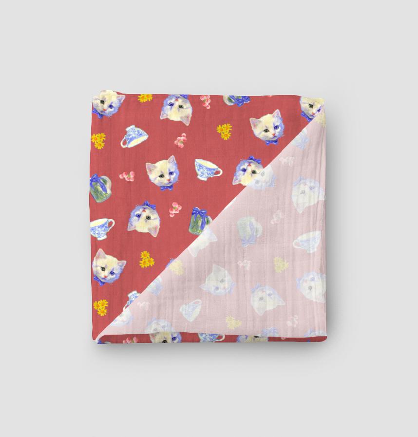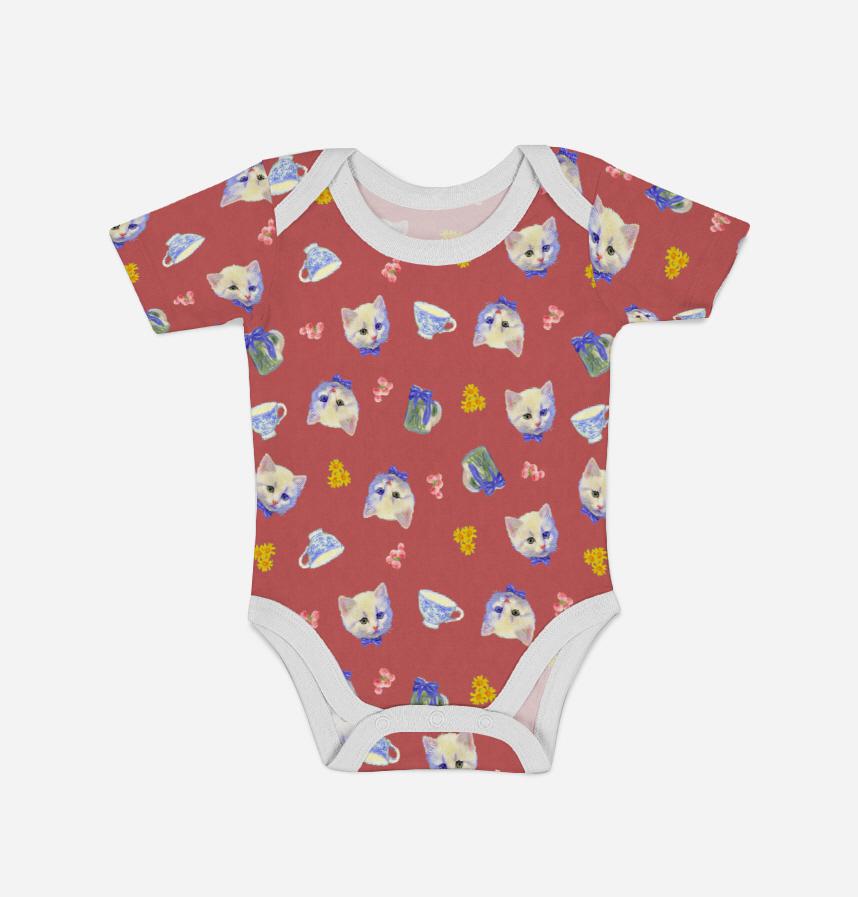 白い子猫に小物や小花をあしらったデザインです。