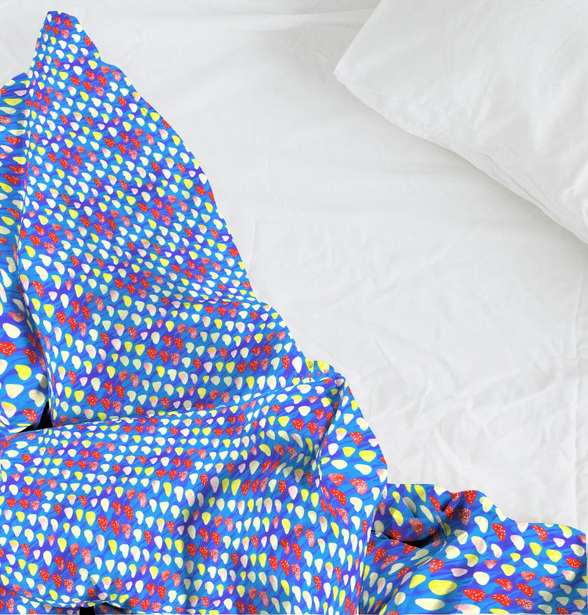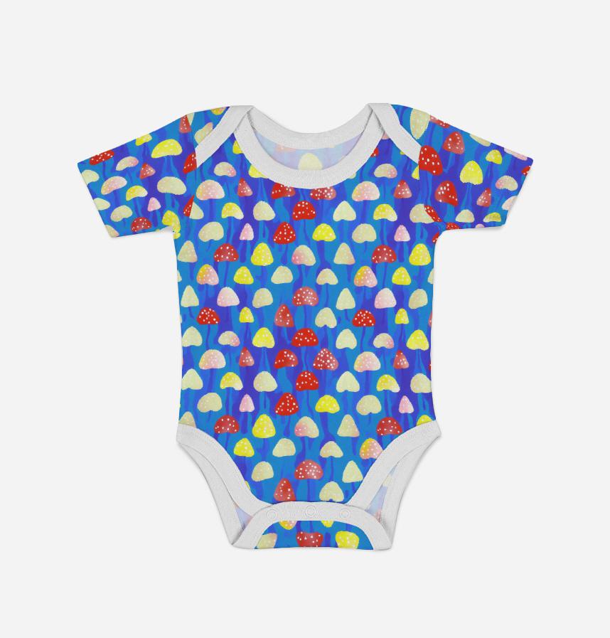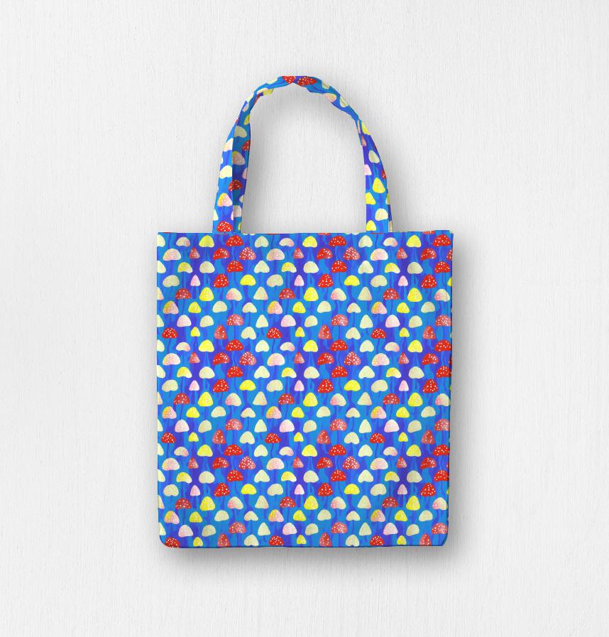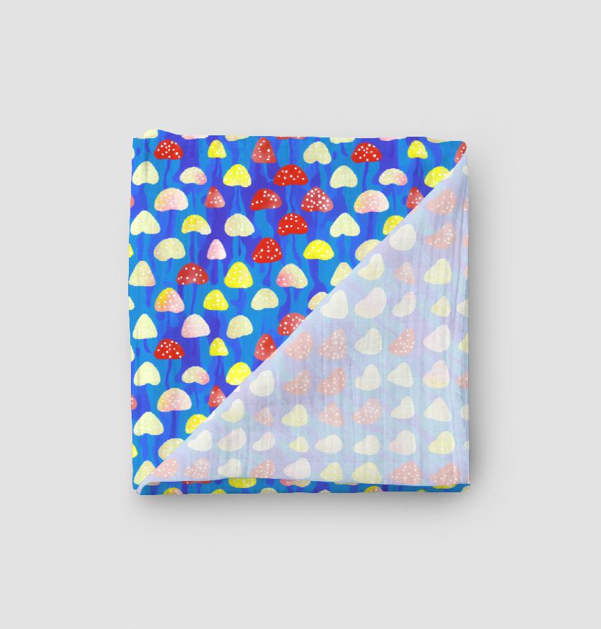 ビビットなブルーの背景に赤や黄色のキノコがドット風に並ぶユーモラスで可愛い生地です。