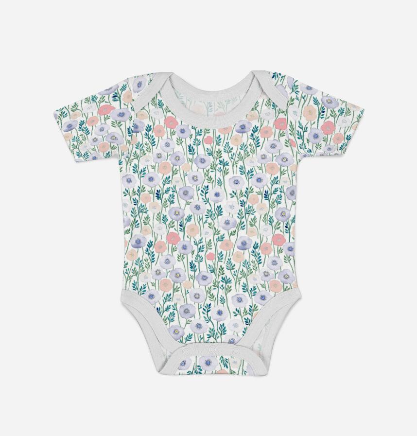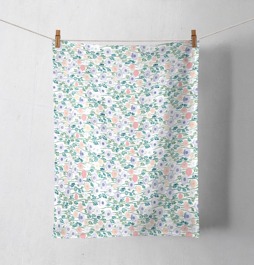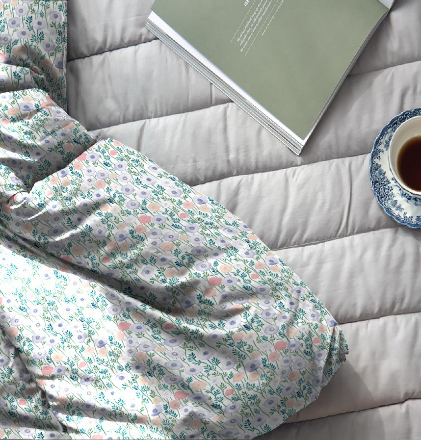 やわらかな色味の花が一面に広がるお花畑のような生地です。