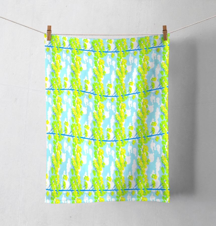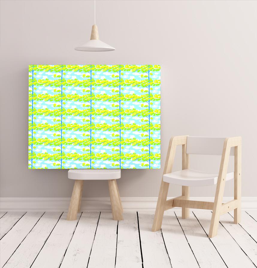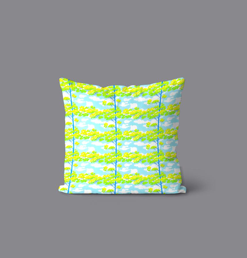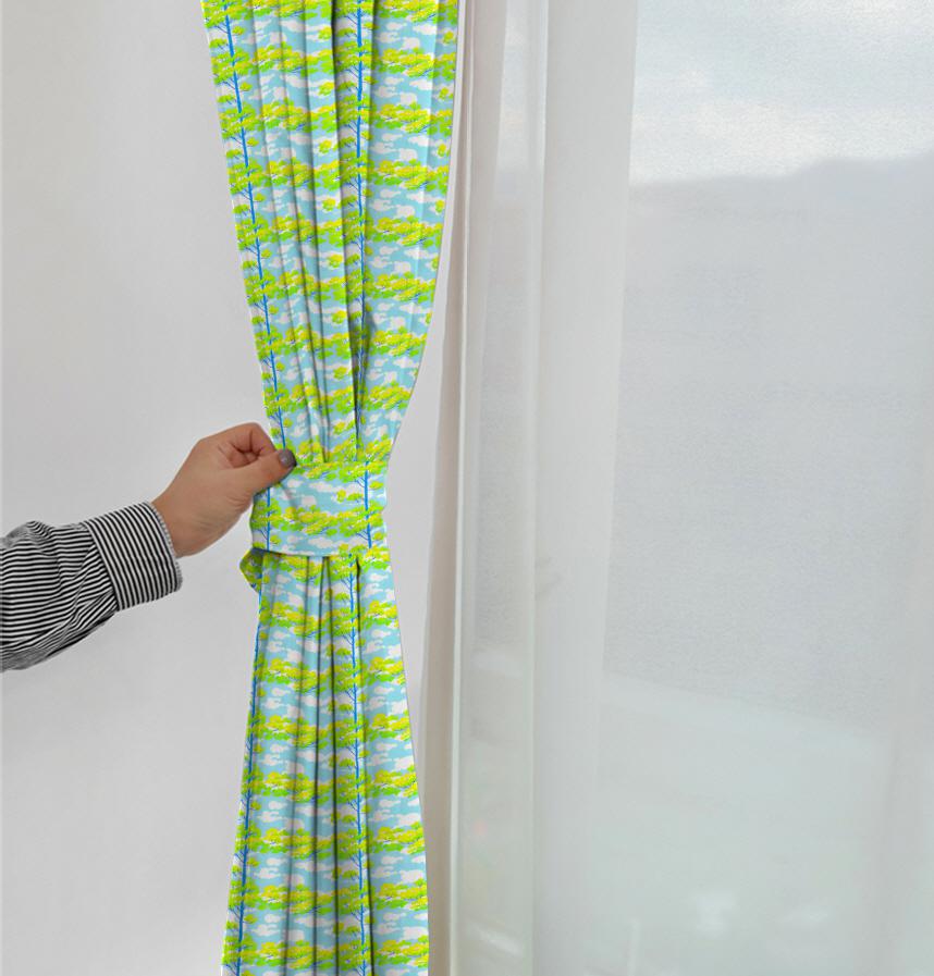 青空を背景にすくすくと木がのびる爽やかな生地です。