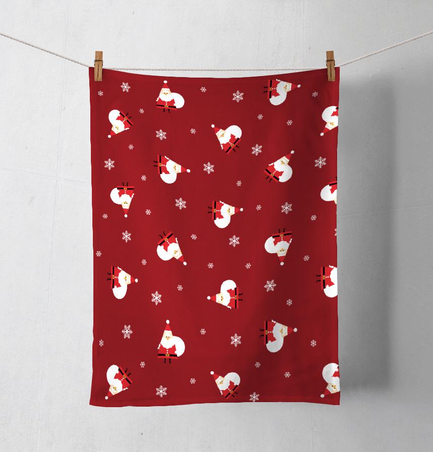 クリスマスグッズにオススメ!かわいいサンタクロースと雪の結晶がデザインされた生地です。