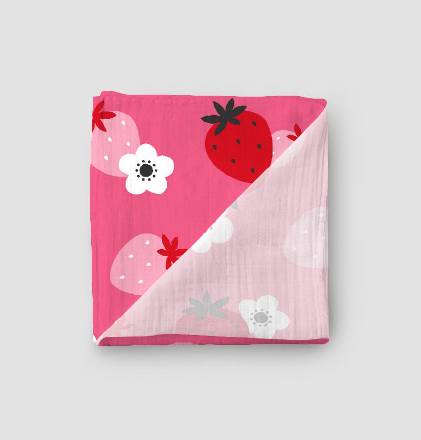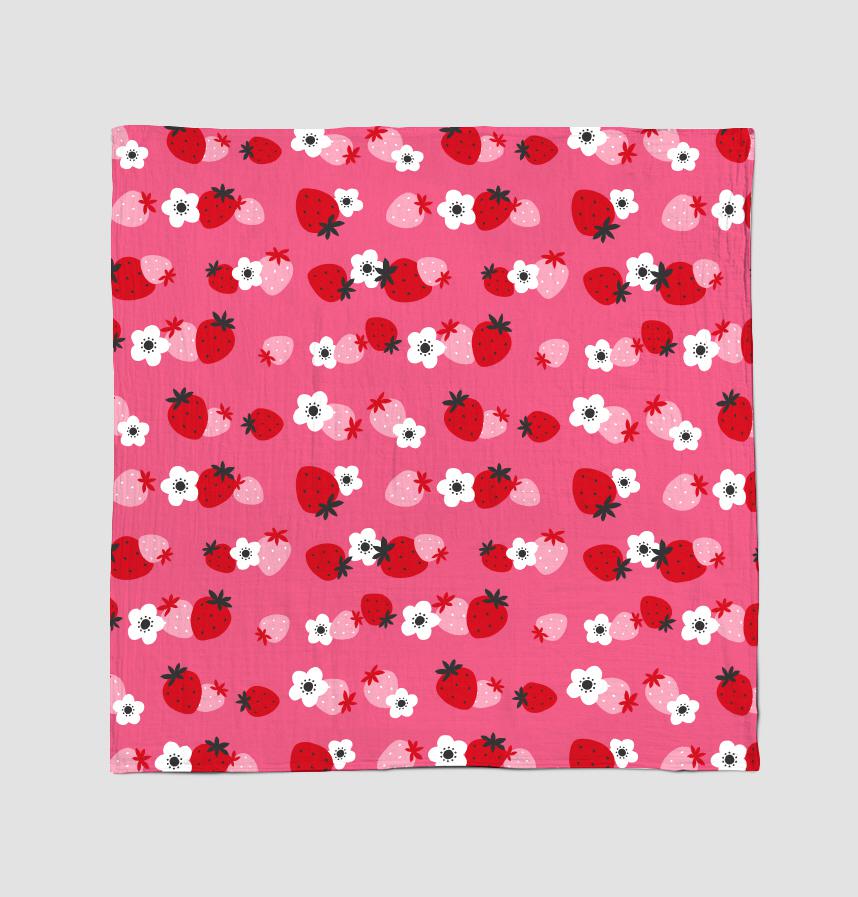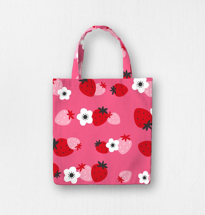 鮮やかなピンクが印象的なキュートなイチゴ模様の生地です。