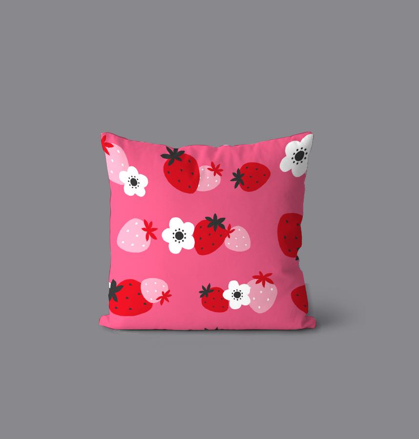 パターン説明 鮮やかなピンクが印象的なキュートなイチゴ模様の生地です。