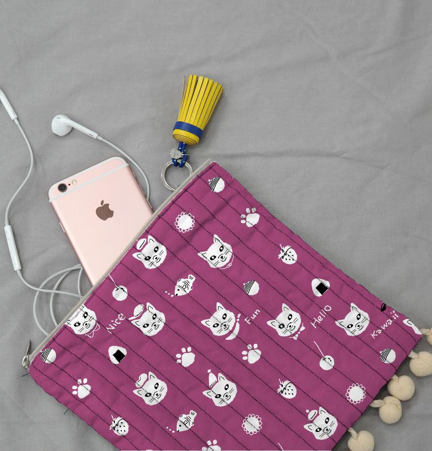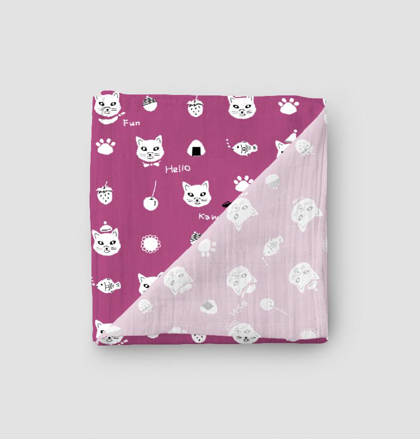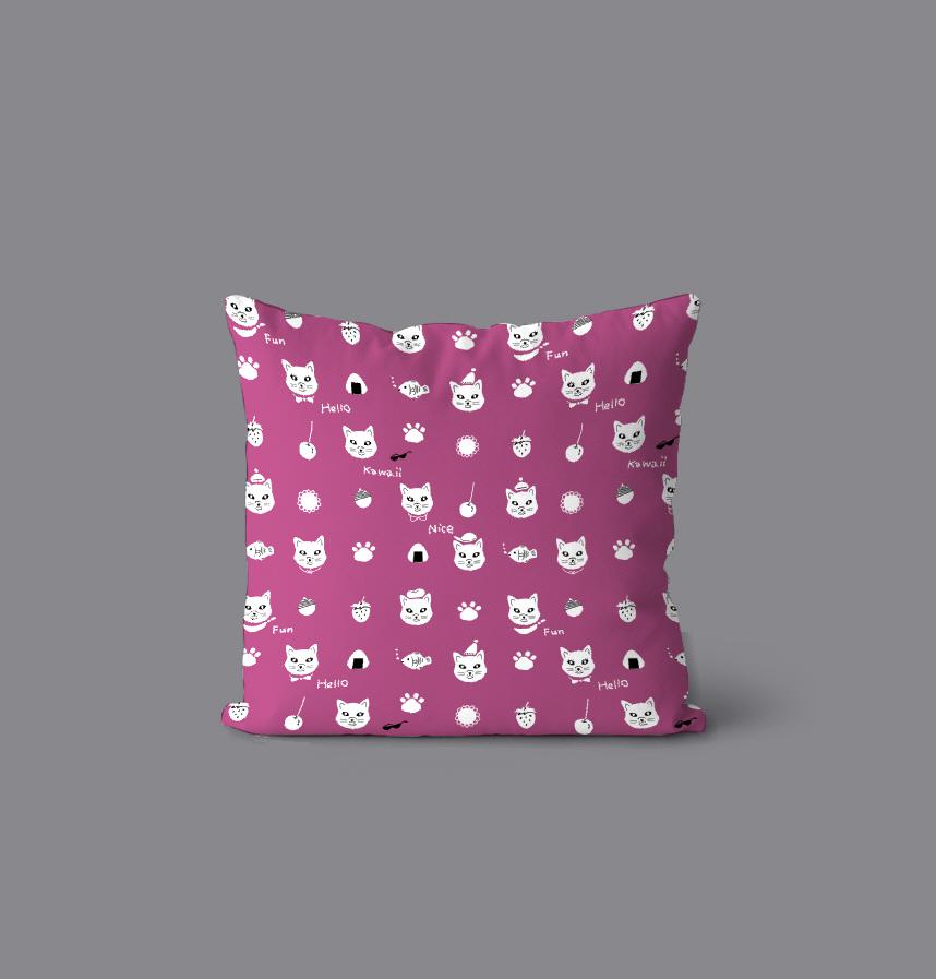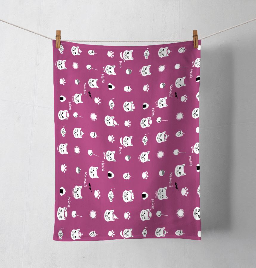 ピンクベースでハンコ柄みたいなネコちゃん達とかわいい雑貨と文字のデザインです。