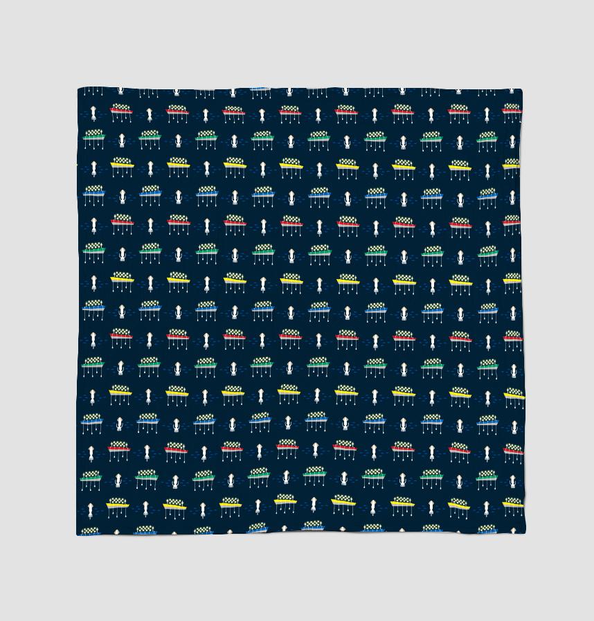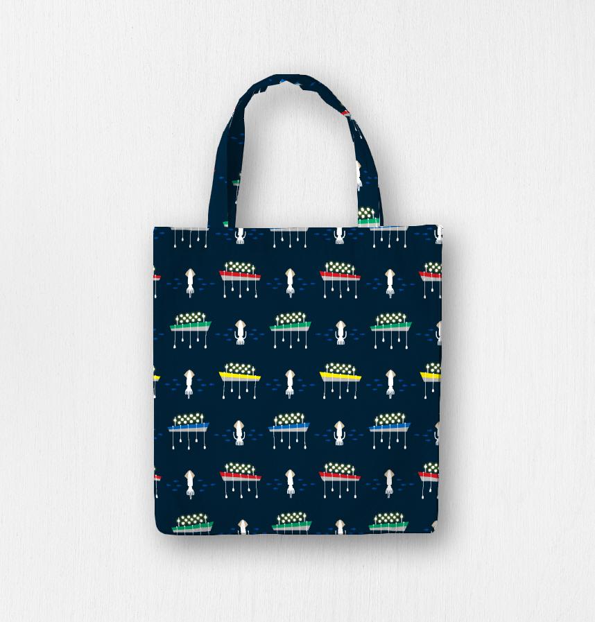 パターン説明 夜間に漁に出るイカ釣り漁船をモチーフにしたパターンです。漁船とイカをランダムに並べ、少し不思議な雰囲気にしました。