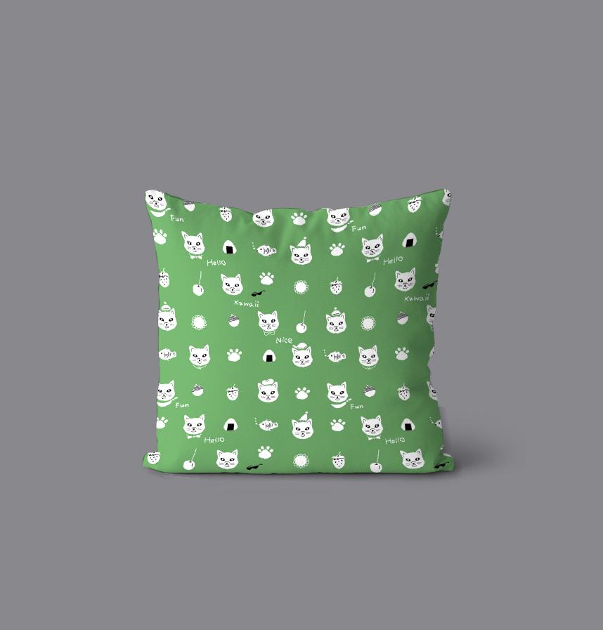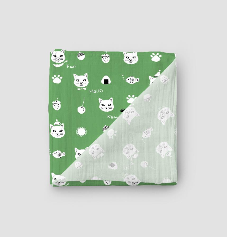 グリーンベースでハンコ柄みたいなネコちゃん達とかわいい雑貨と文字のデザインです。