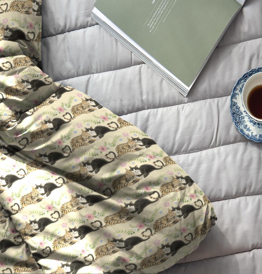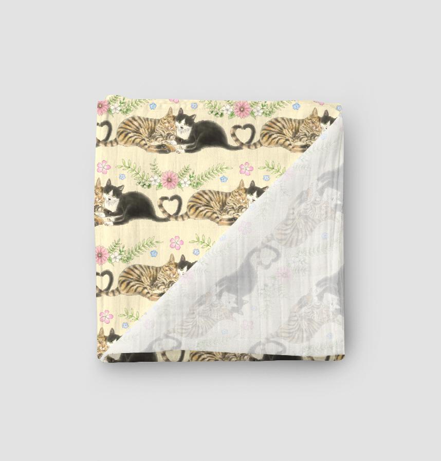 仲良く寄り添うハチワレ猫とキジトラ猫の連続模様です。尻尾が絡んでハートになっています。