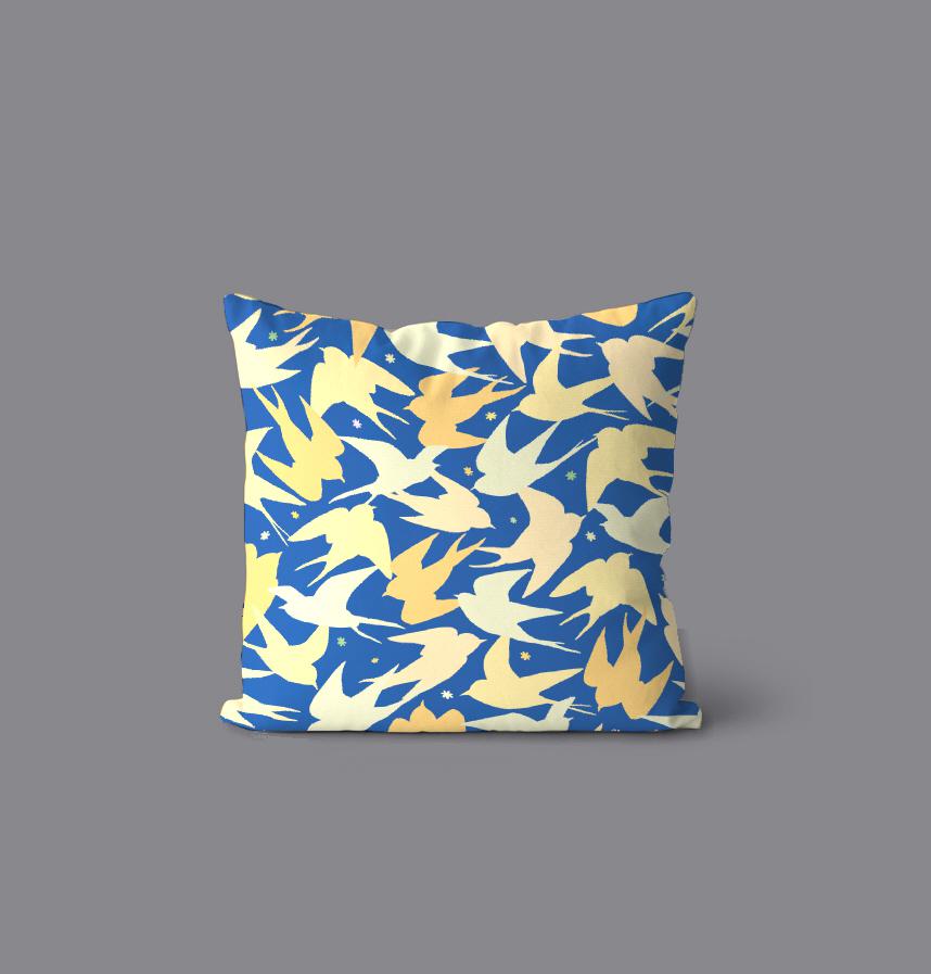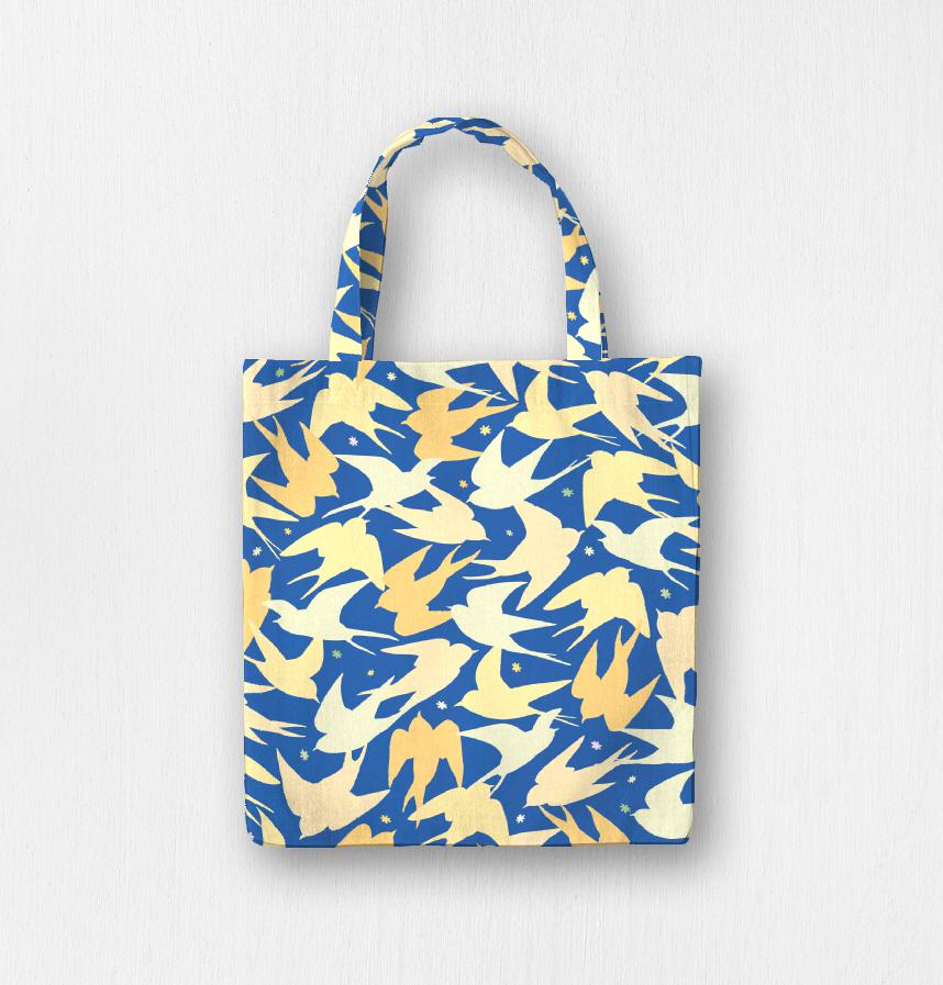 パターン説明 青い背景に抽象的なツバメ柄。シャツや雑貨におすすめ。