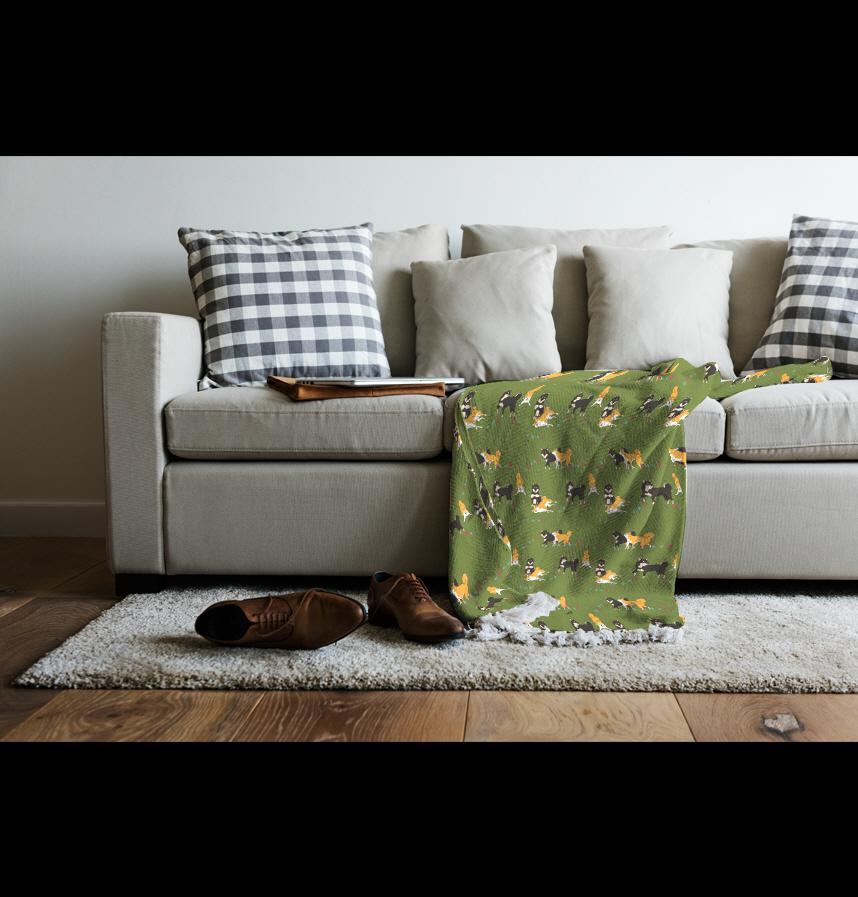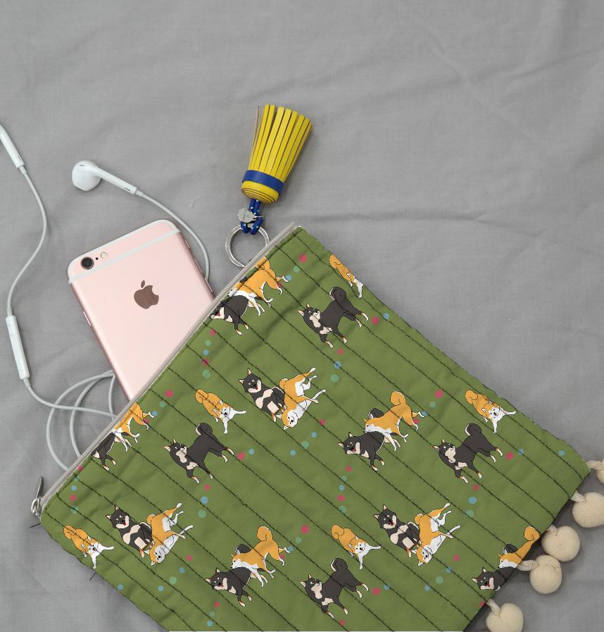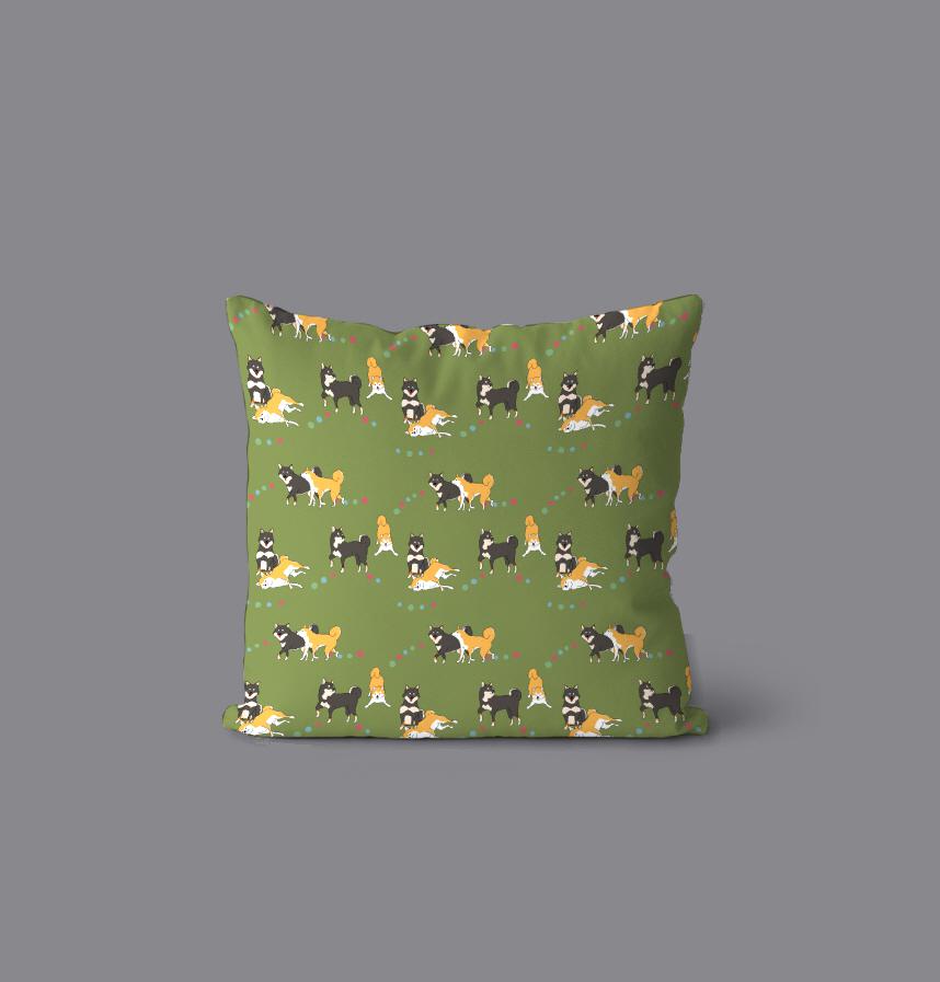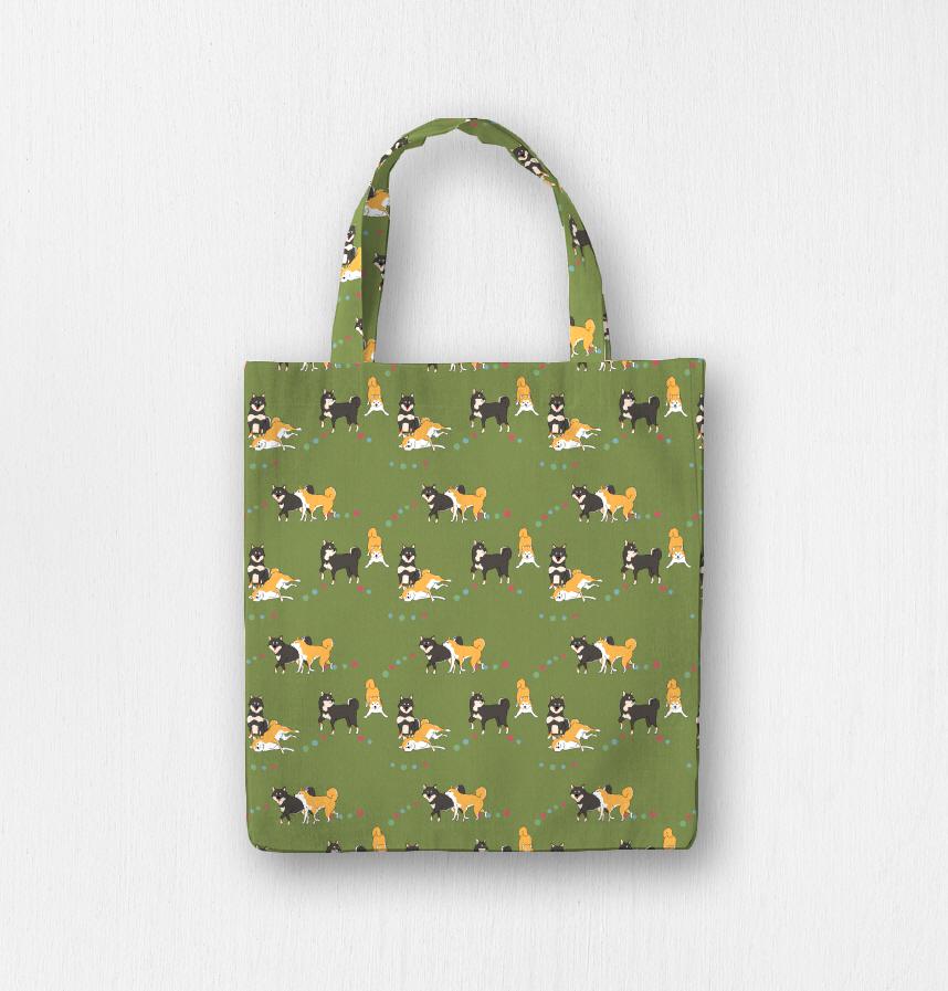 パターン名 わんこシリーズ「黒柴・茶柴犬のお散歩」カーキ背景