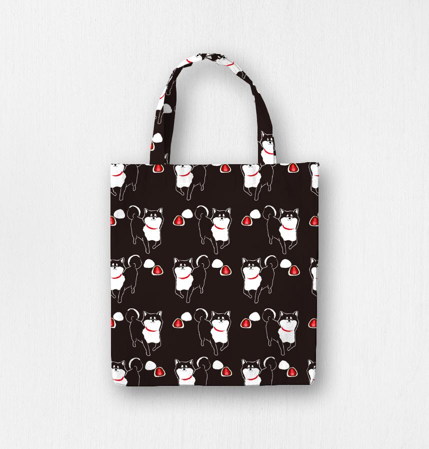 にこにこ顔の黒柴犬といちご大福の組み合わせ。背景の色合いを基調とした柄で作ってみました。和犬と和菓子の組み合わせで左向き右向きで組み合わせています。