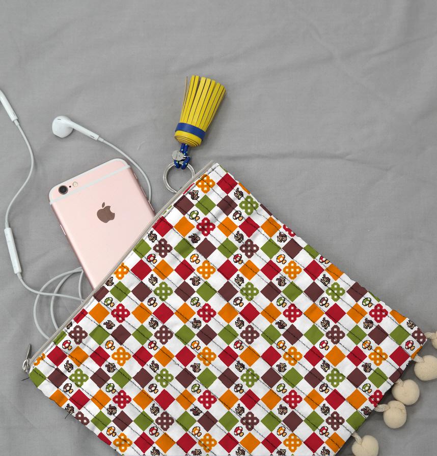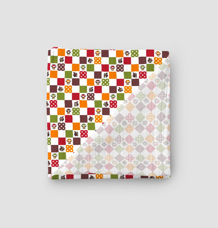 パターン説明 キノコと格子柄とかわいいモチーフを配置したデザインです。