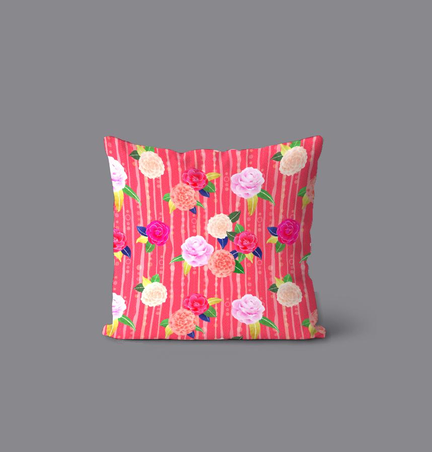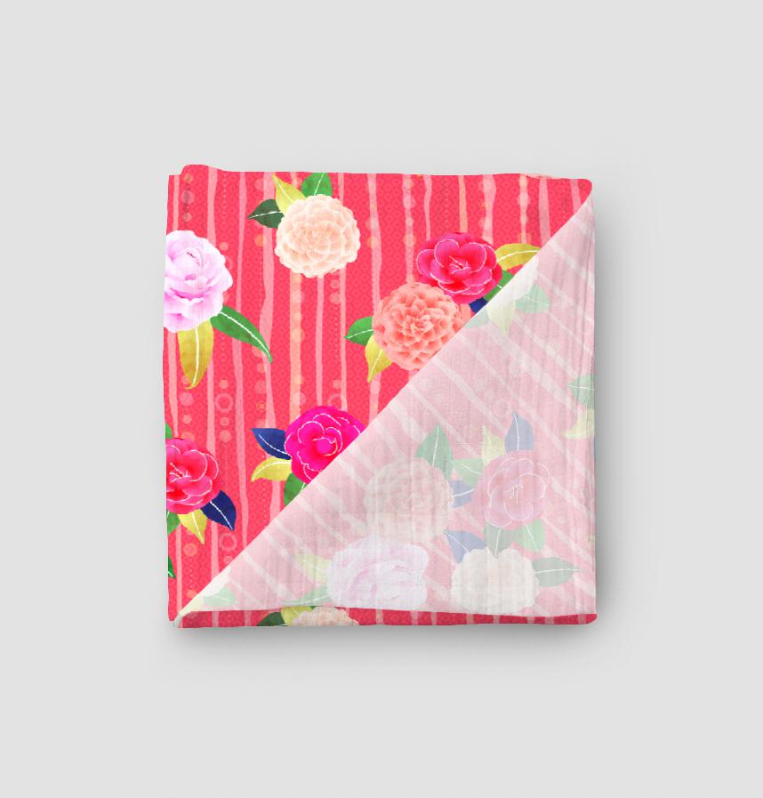 よろけ縞とドットを背景にしたおきゃんな姫椿。