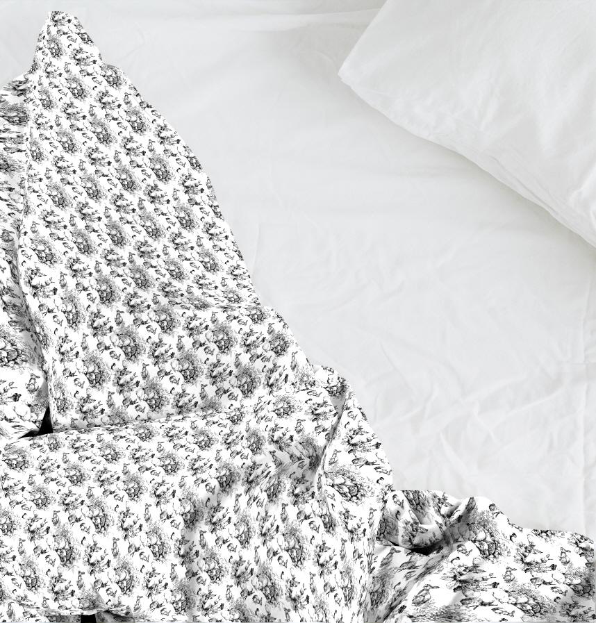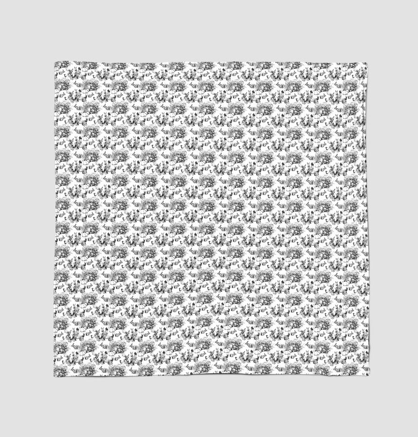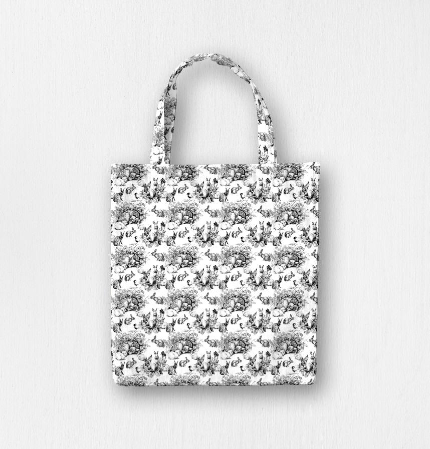 ペンで細かいタッチで描いたうさぎさんと森の仲間たちの絵を模様にしました。