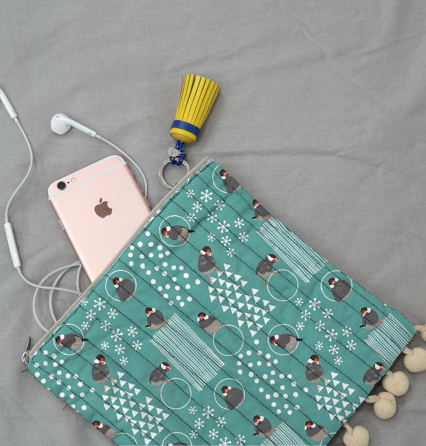 落ち着いた色味の北欧風なちょっと縦長模様に桜文鳥を散りばめました(サムネイル約16cm四方)。