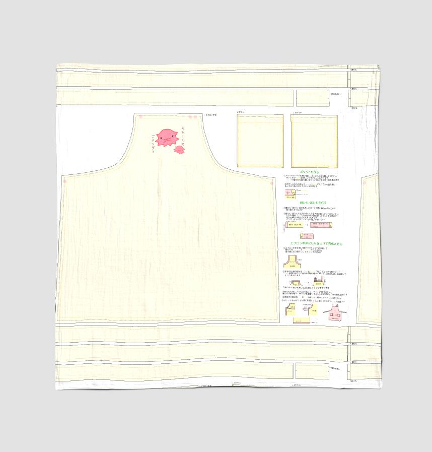レシピ通りに切って縫うだけでオリジナルのエプロンが作れるキット風のデザインです。