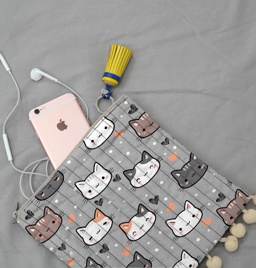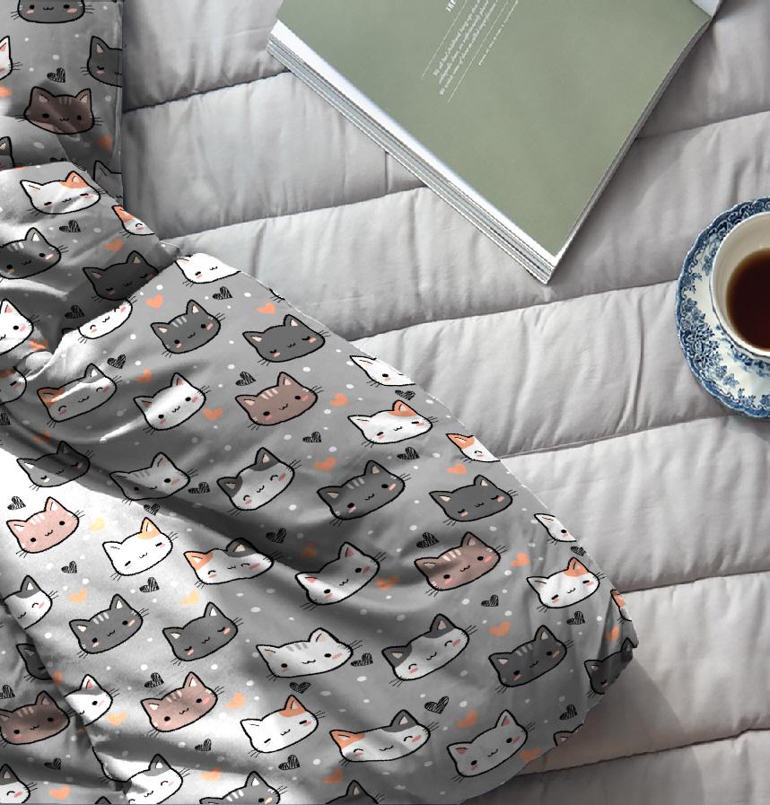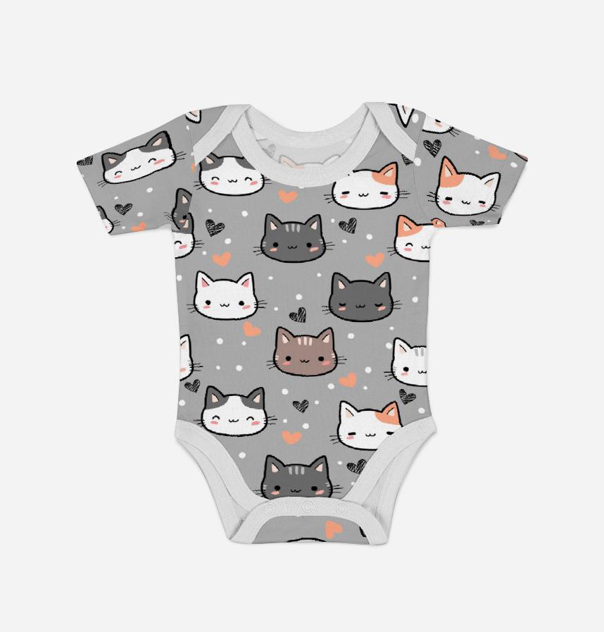 グレートーンのかわいいニャンコとハートのパターンデザイン。