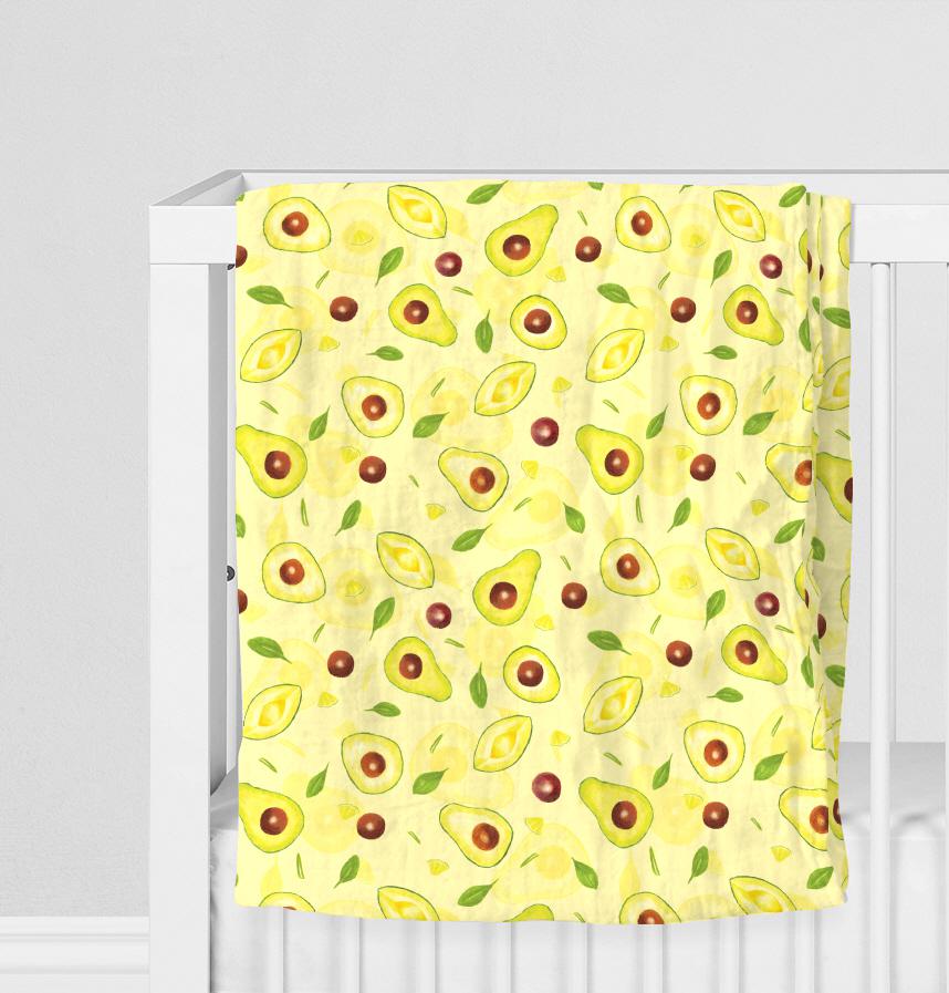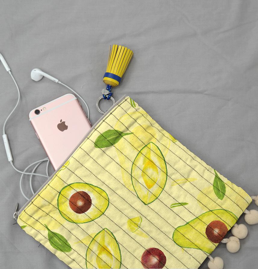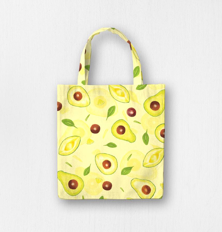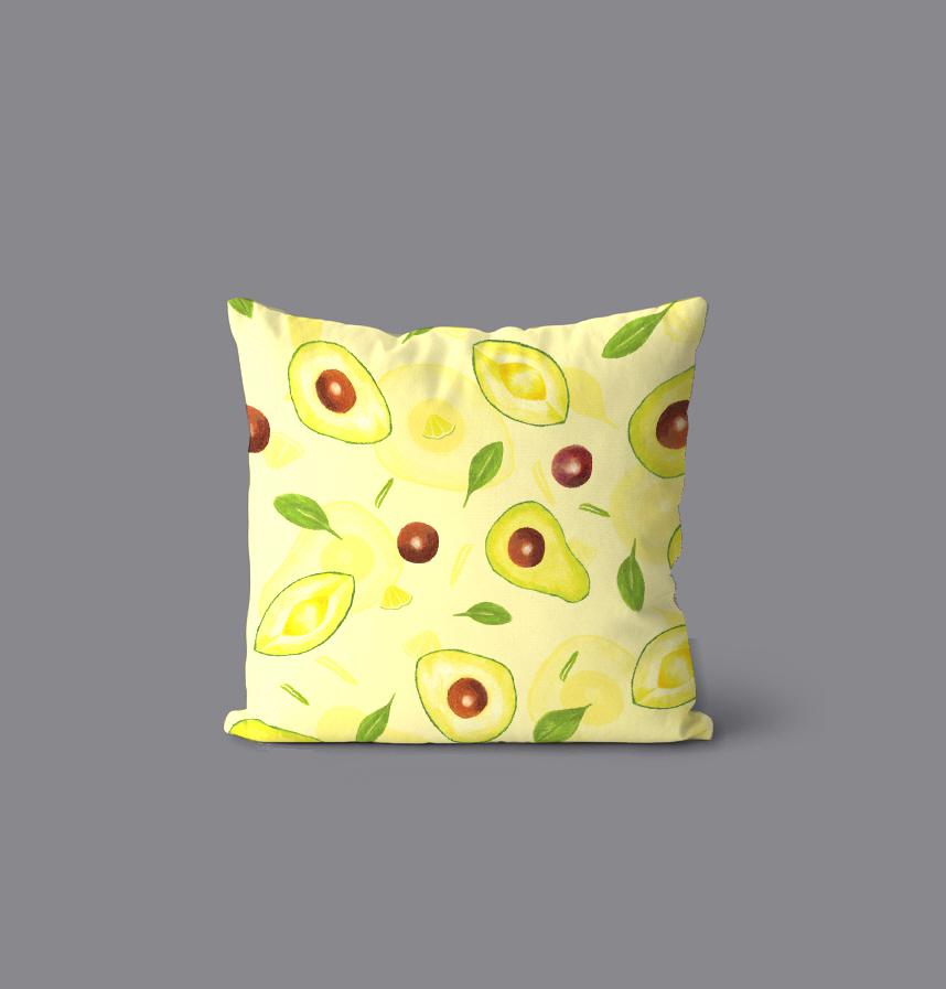フルーツの中でアボカドと小さな葉っぱを色鉛筆で手描きしたデザイン。