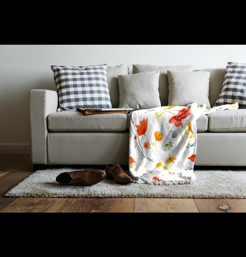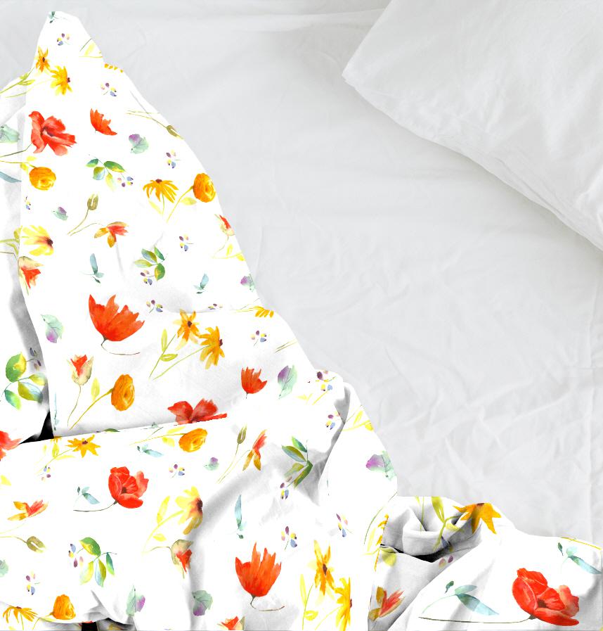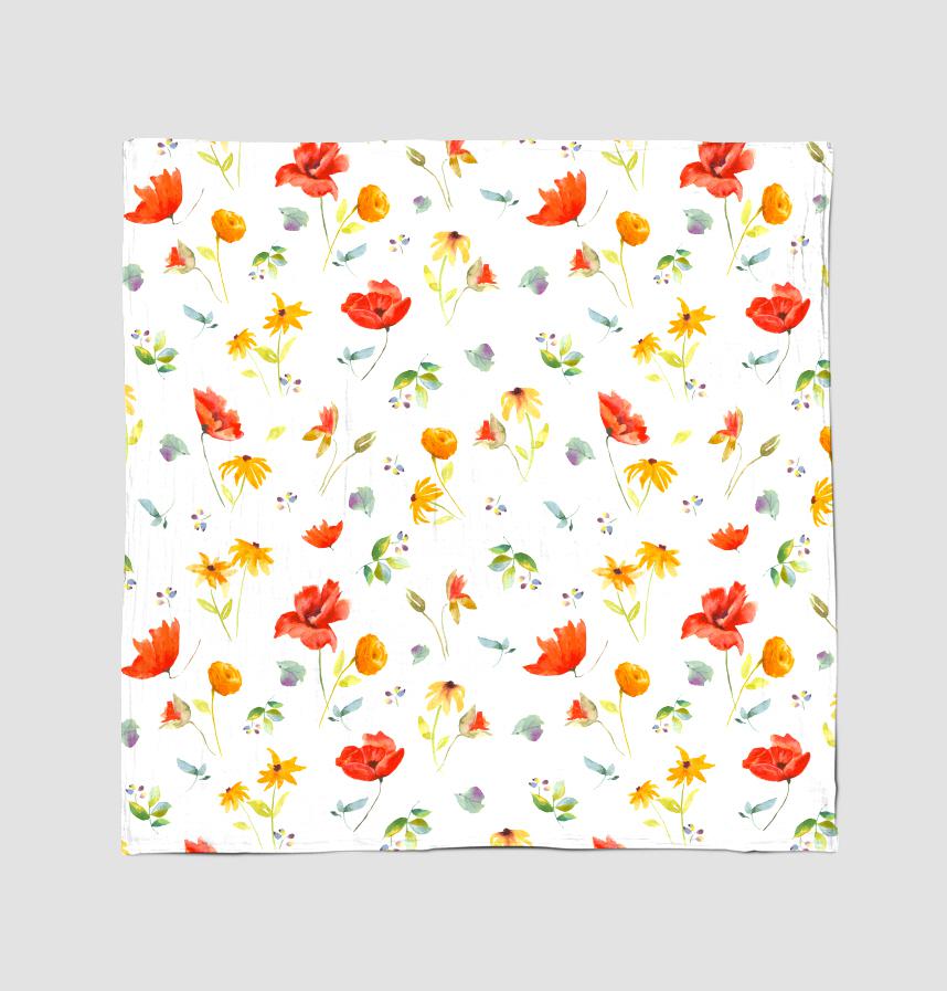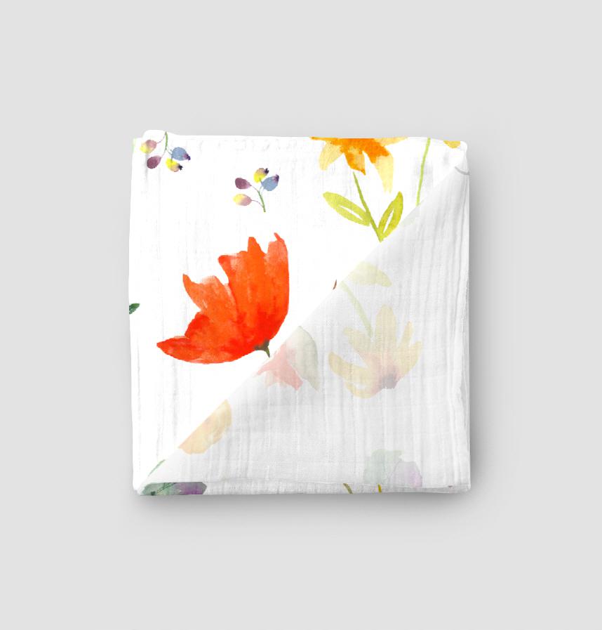 手描きの水彩画のケシと調和のとれた小さな花、葉っぱが穏やかで自然に調和したデザイン。