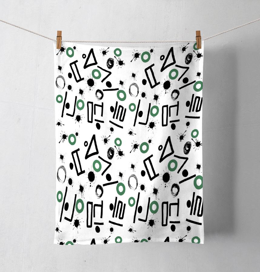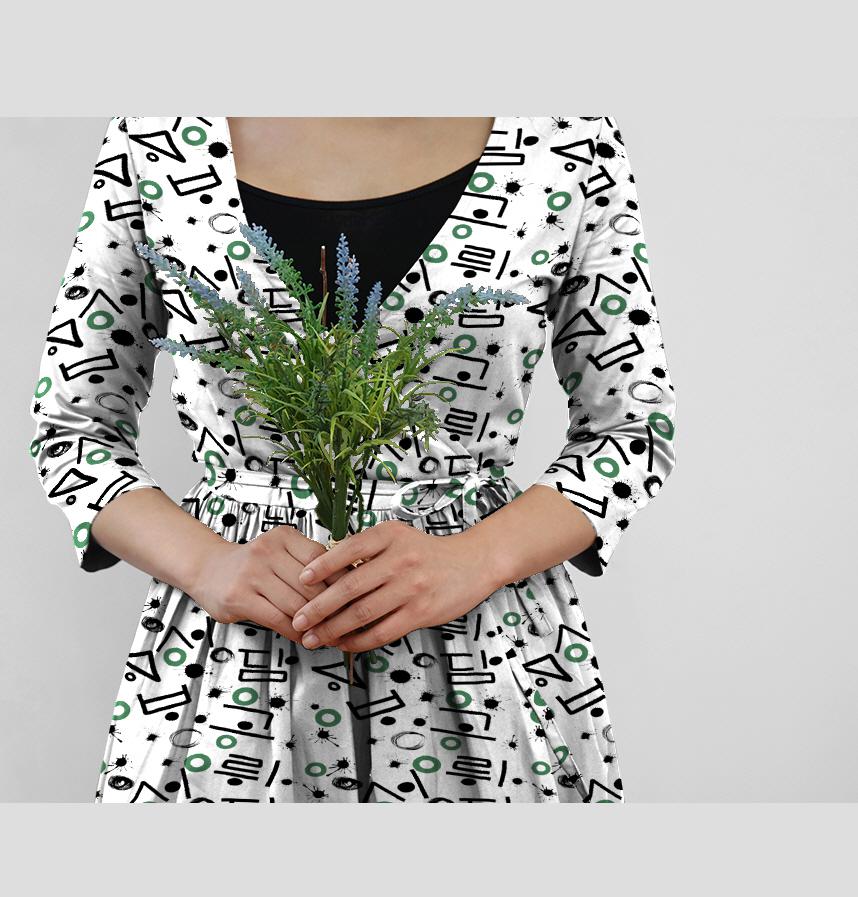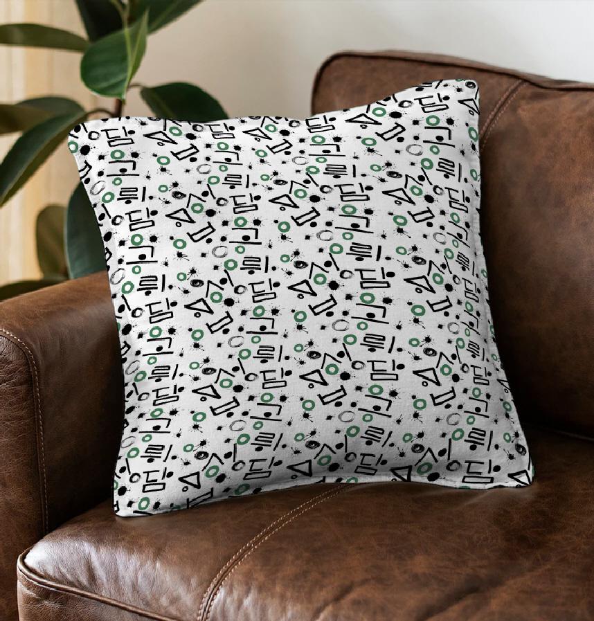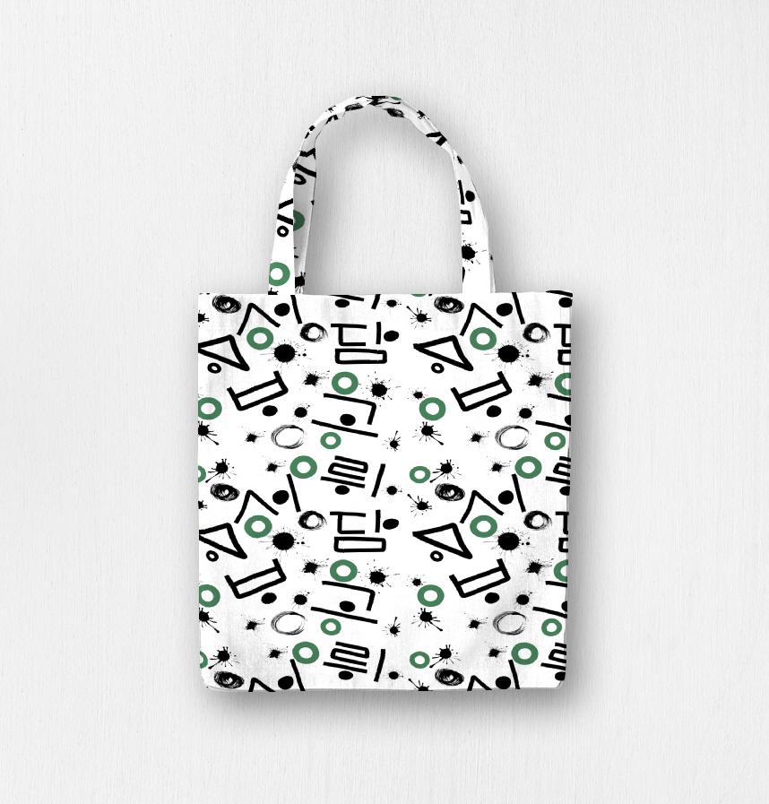 ハングルとグリーンドーナツ型の自由な動きが感じられるパターンデザインです