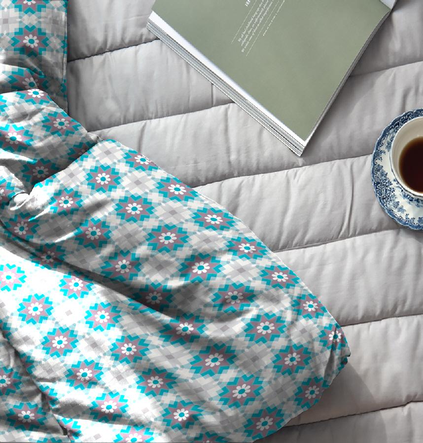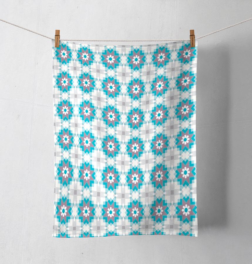 ミント色の幾何学模様と花の調和のとれたパターンデザイン。