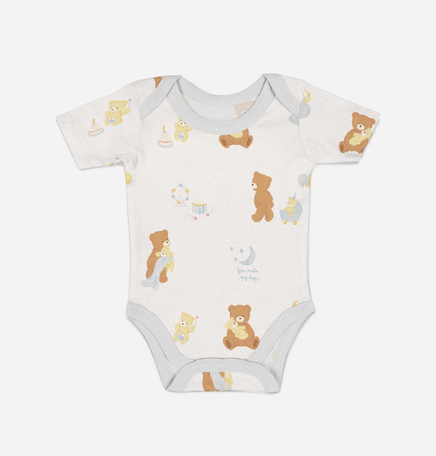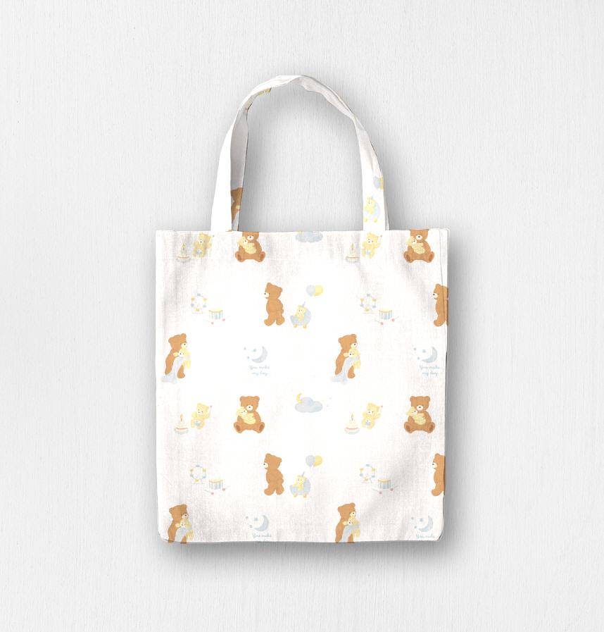 パターン説明 手描き風のくまのぬいぐるみ柄です。ベビーモチーフをあしらい可愛らしく上品なイメージです。