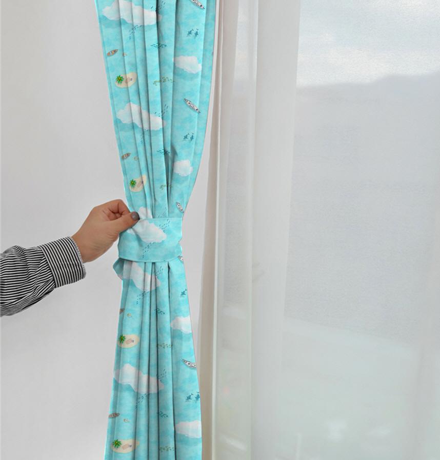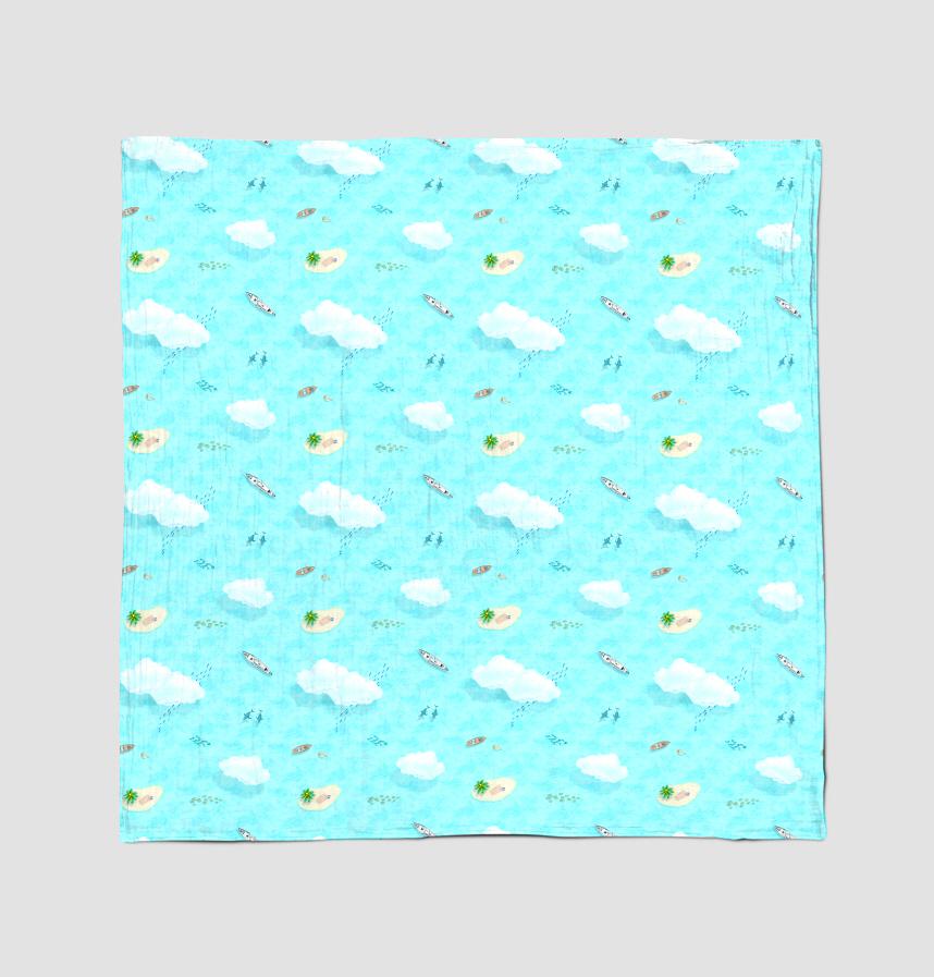 大小のボート、小さな島、浮き輪でくつろぐ人、魚の群れやイルカなど、海っぽいモチーフが散らばります。
